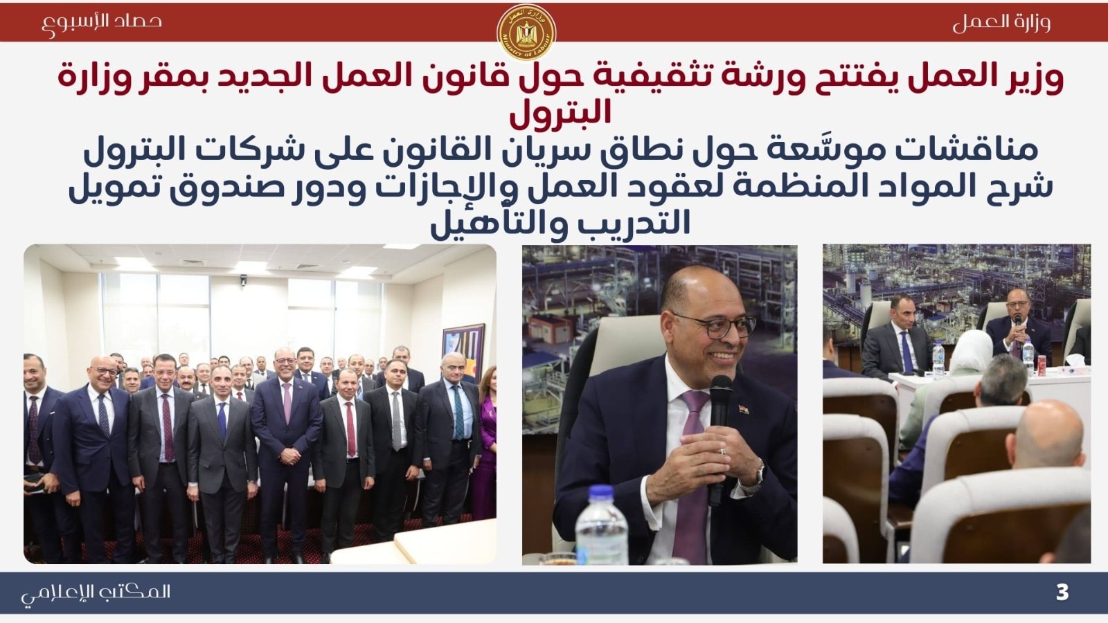 لمناقشات موسعة حول نطاق سريان القانون على شركات البترول،افتتح الوزير ورشة تثقيفية لشرح أحكام قانون العمل الجديد رقم (14) لسنة 2025، بمشاركة ممثلي شركات البترول، حيث أكد أن القانون يترجم توجيهات القيادة السياسية لتحقيق التوازن بين طرفي العملية الإنتاجية وتعزيز مناخ العمل اللائق.