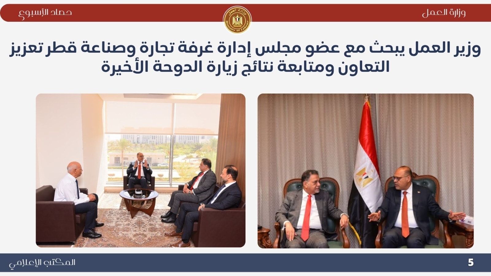 لمتابعة نتائج زيارة الدوحة الأخيرة وبحث آفاق التشغيل والتدريب المشترك ،استقبل الوزير محمد جبران سعادة محمد بن أحمد العبيدلي عضو مجلس إدارة غرفة تجارة وصناعة قطر، حيث جرى بحث تنفيذ التفاهمات التي تمت خلال زيارة الوزير للدوحة، وتعزيز التعاون في مجالات العمل والتدريب والتشغيل، بما يخدم مصالح البلدين ويدعم جهود التنمية في الجانبين.