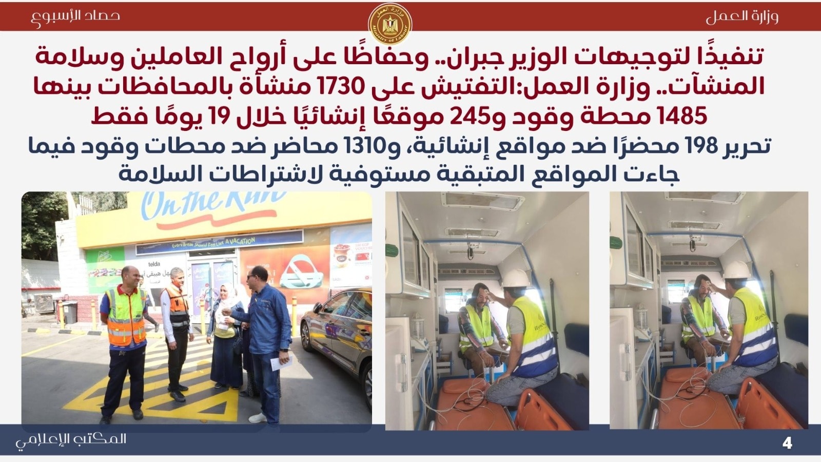 وأعلنت وزارة العمل نتائج حملات التفتيش الميدانية للتأكد من تطبيق اشتراطات السلامة والصحة المهنية وفقًا للقانون الجديد، حيث تم تحرير 198 محضرًا ضد مواقع إنشائية و1310 محاضر ضد محطات وقود مخالفة، فيما جاءت بقية المنشآت مستوفية للاشتراطات، تأكيدًا لحرص الوزارة على حماية العاملين وسلامة بيئة العمل.