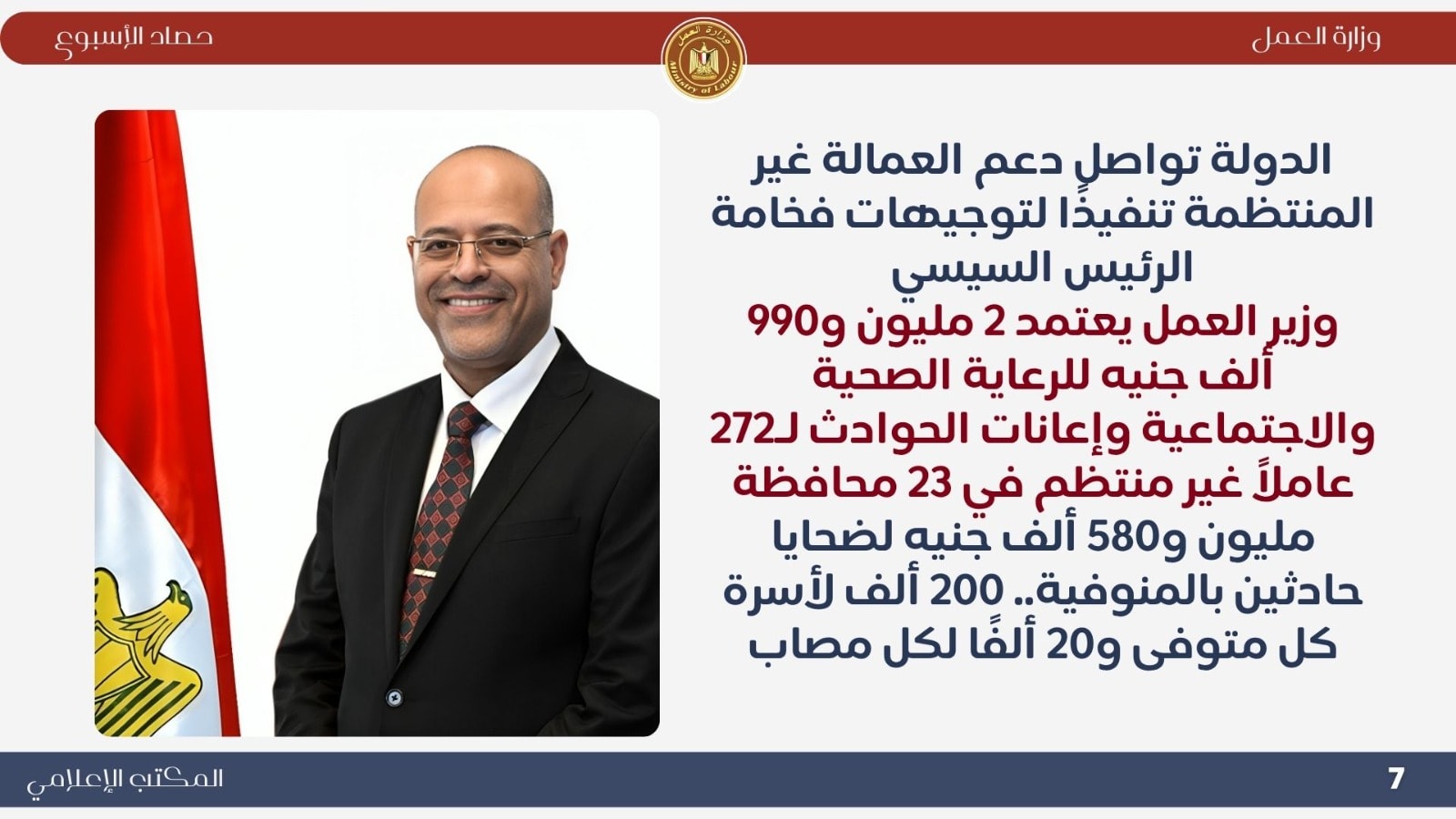 وزير العمل يعتمد 2.99 مليون جنيه لرعاية 272 عاملاً غير منتظم في 23 محافظة