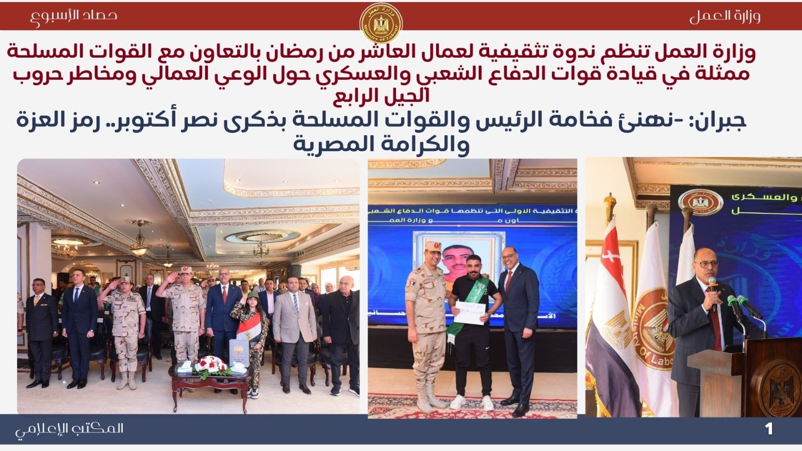 نظمت الوزارة ندوة تثقيفية بمدينة العاشر من رمضان بالتعاون مع قيادة قوات الدفاع الشعبي والعسكري، تناولت أهمية الوعي الوطني في مواجهة حروب الجيل الرابع. وأكد الوزير أن الوعي هو خط الدفاع الأول عن الوطن، فيما أشاد قائد قوات الدفاع الشعبي بالعامل المصري بوصفه “جندي الإنتاج”. وشهدت الندوة تكريم أسر الشهداء وتسليم عقود لذوي الهمم وشهادات لخريجي التدريب المهني.