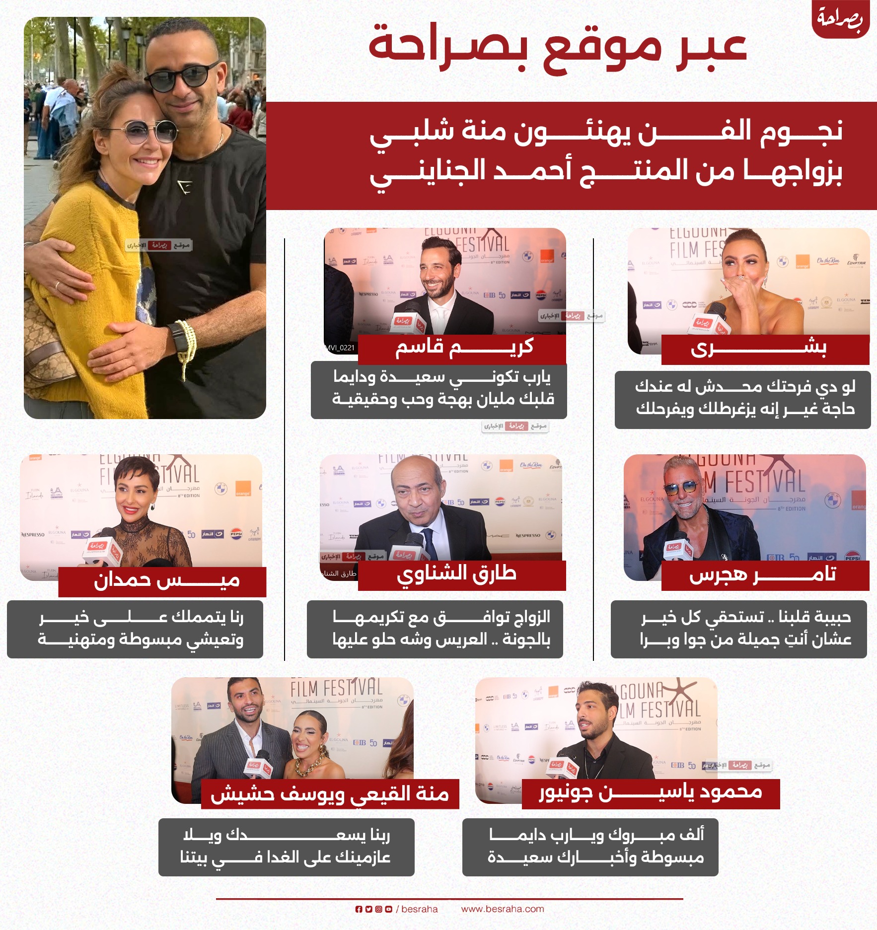 عبر موقع بصراحة.. نجوم الفن يهنئون منة شلبي بزواجها من المنتج أحمد الجنايني