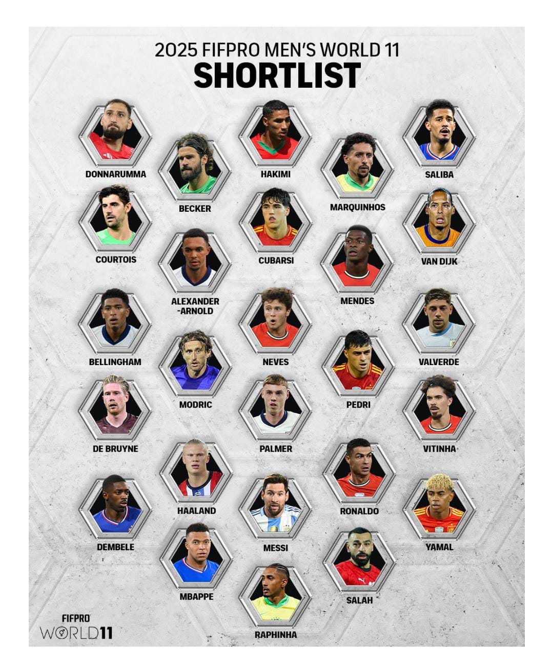 تشهد القائمة منافسة شرسة بين أبرز نجوم كرة القدم في العالم، وعلى رأسهم ميسي، رونالدو، مبابي، وهالاند، إلى جانب محمد صلاح الذي يسعى لاقتحام التشكيل المثالي لأول مرة في مسيرته.