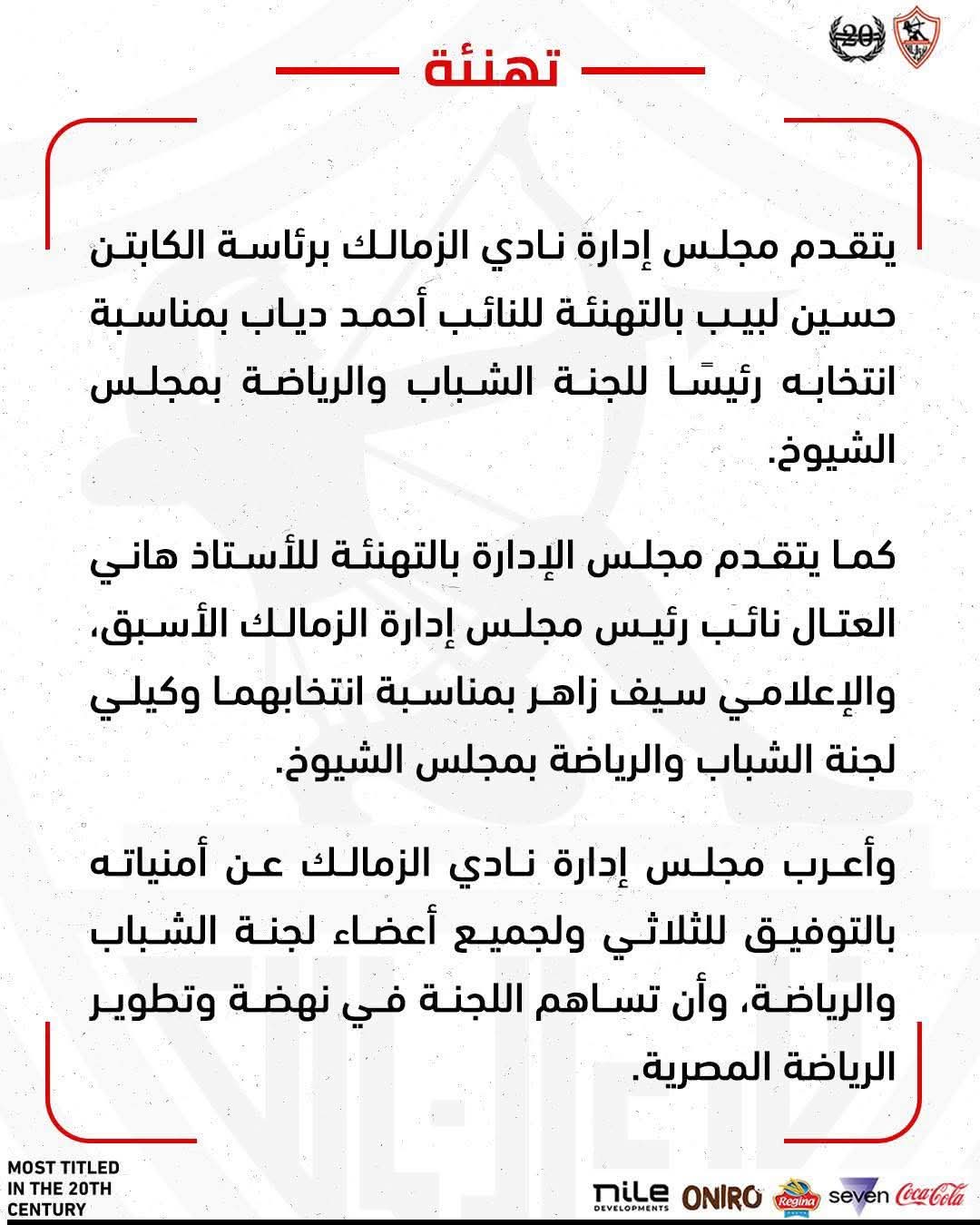 تقدم مجلس إدارة نادي الزمالك برئاسة الكابتن حسين لبيب بخالص التهنئة إلى النائب أحمد دياب، بمناسبة انتخابه رئيسًا للجنة الشباب والرياضة بمجلس الشيوخ، متمنيًا له دوام التوفيق والنجاح في مهامه الجديدة.