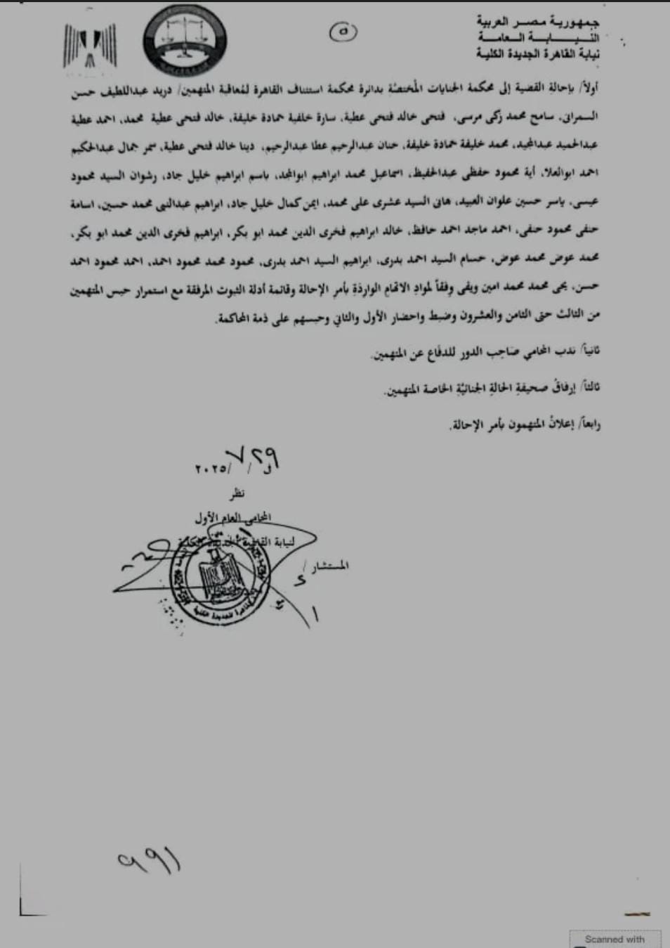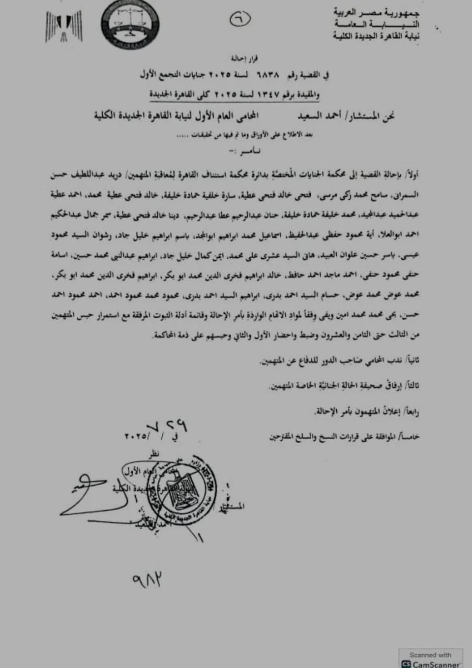 وفي ختام أمر الإحالة، قررت النيابة رفع أوراق القضية إلى المستشار المحامي العام الأول لنيابة القاهرة الجديدة الكلية لمراجعة أقوال الشهود وأدلة الإثبات وتحديد موعد أولى جلسات المحاكمة أمام محكمة الجنايات المختصة.