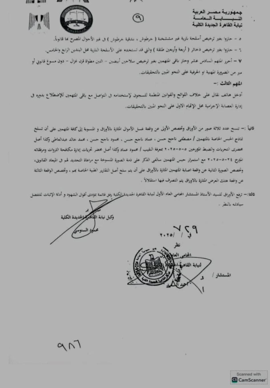 وأمرت النيابة بنسخ ثلاث صور من أوراق القضية: الصورة الأولى تخص واقعة غسل الأموال المتحصلة من تجارة المواد المخدرة والمنسوبة إلى المتهمين مصطفى ناجح حسن، عماد ناجح حسن، محمود ناجح حسن، ومحمد خالد عبد العاطي، مع ضم محاضر التحريات والتقارير المالية.