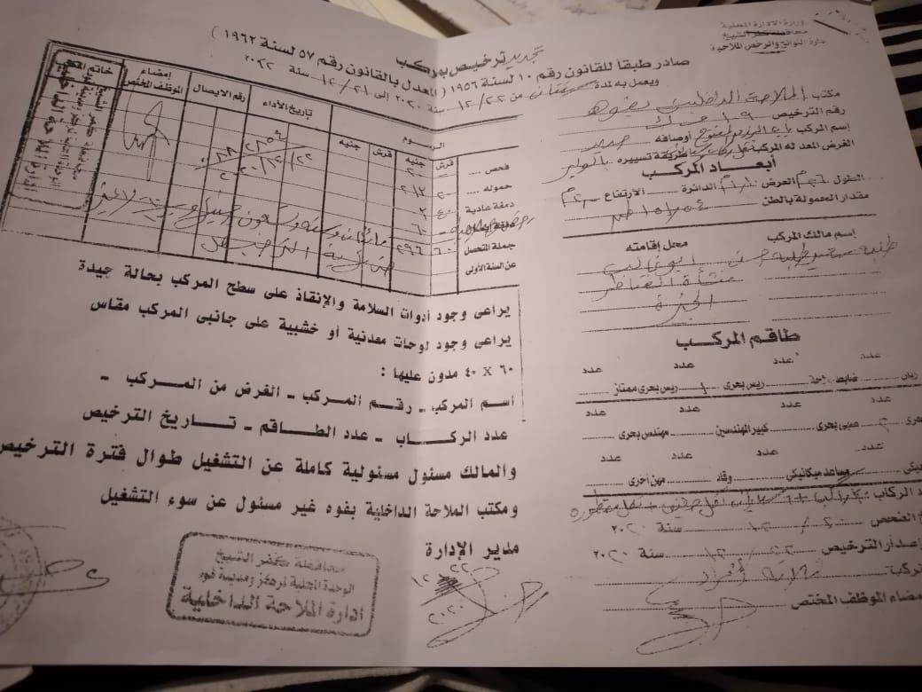 كما أن المعدية بدون ترخيص نهائيا منذ نوفمبر ٢٠١٨ ويوجد قرارات من الهيئة العامة للنقل النهري تؤكد عدم صلاحيتها للعمل وقرارات بالغلق والتشميع من الرقابة النهرية.