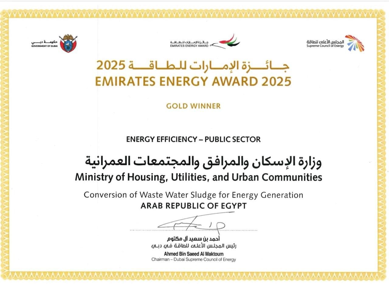وزارة الإسكان تفوز بجائزة الإمارات للطاقة عن مشروع تحويل الحمأة إلى طاقة بالإسكندرية