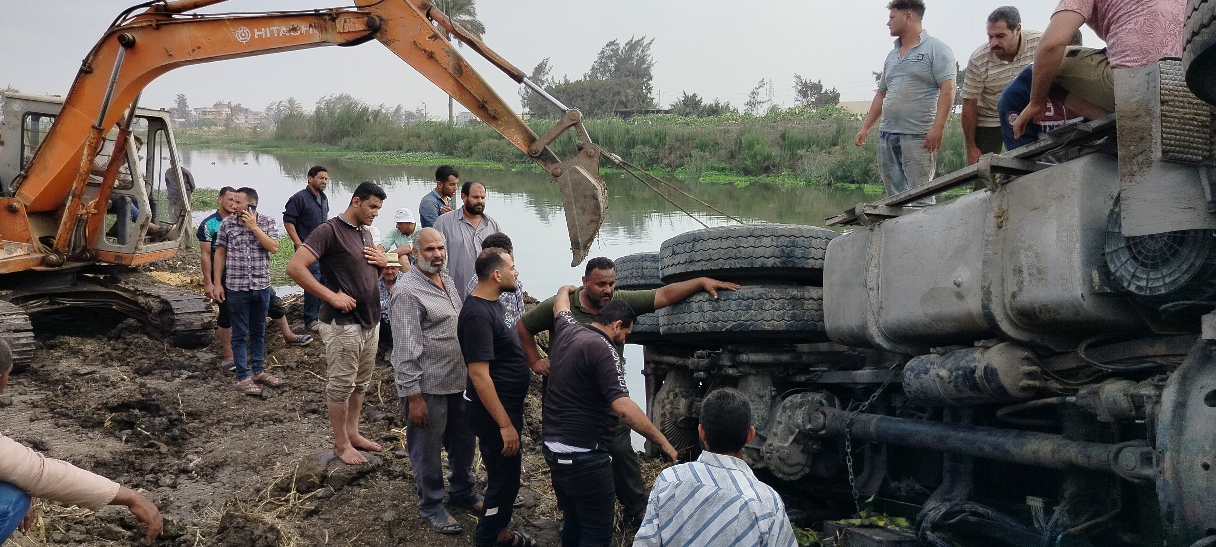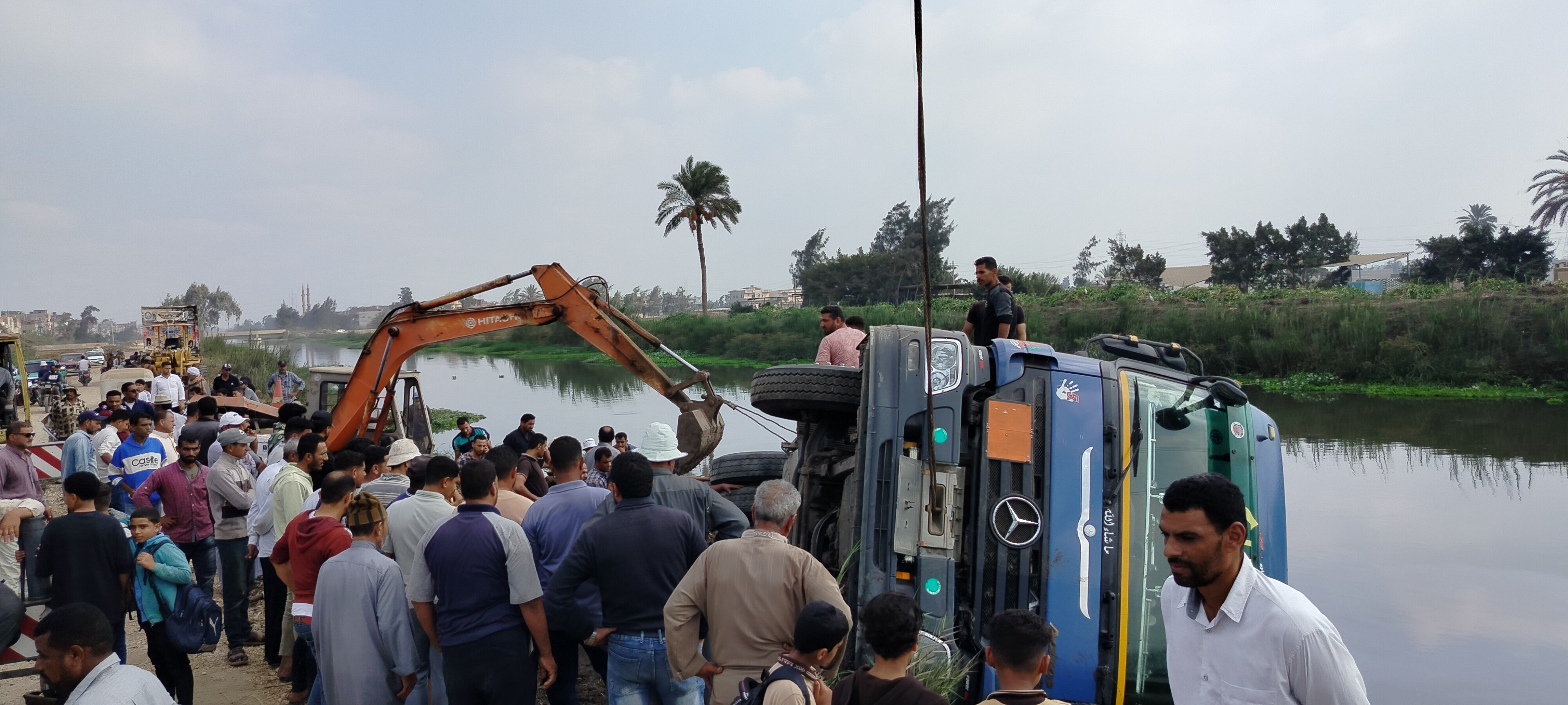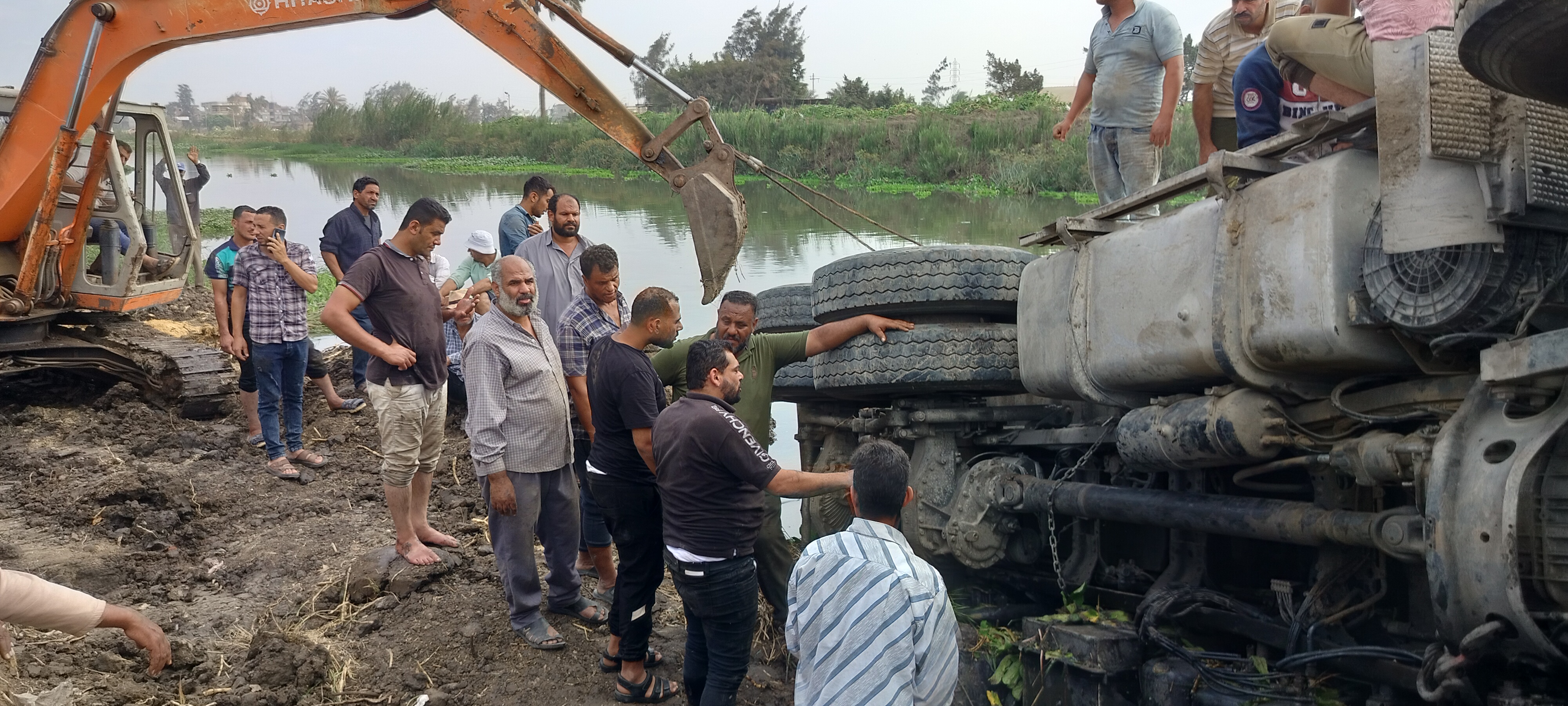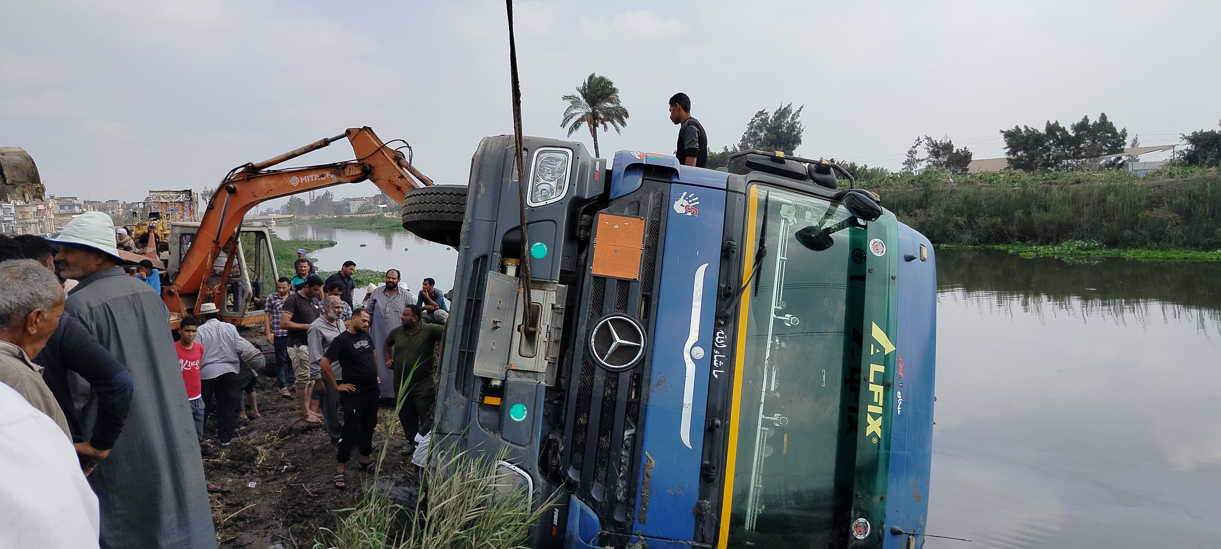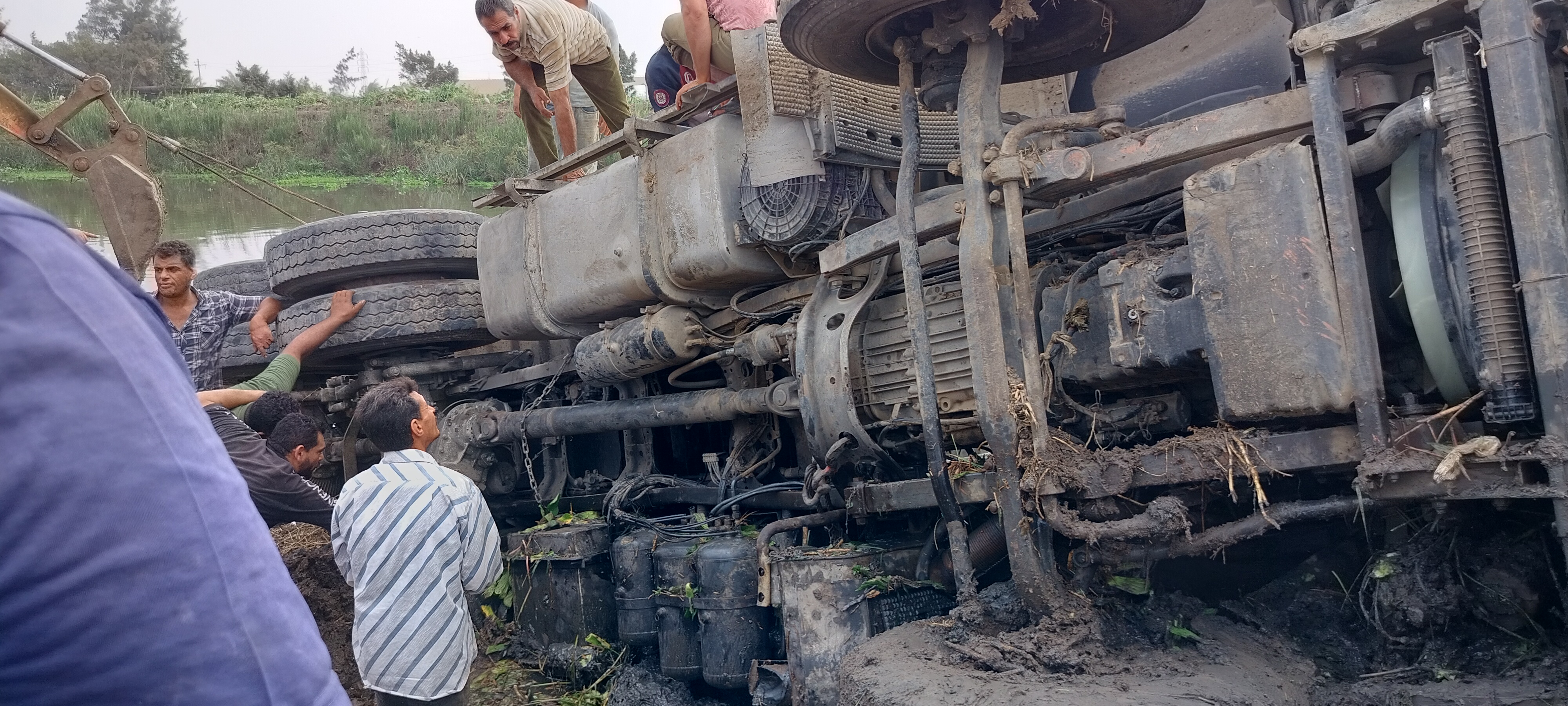 انقلاب سيارة نقل ثقيل داخل مصرف عموم البحيرة في دكرنس بالدقهلية