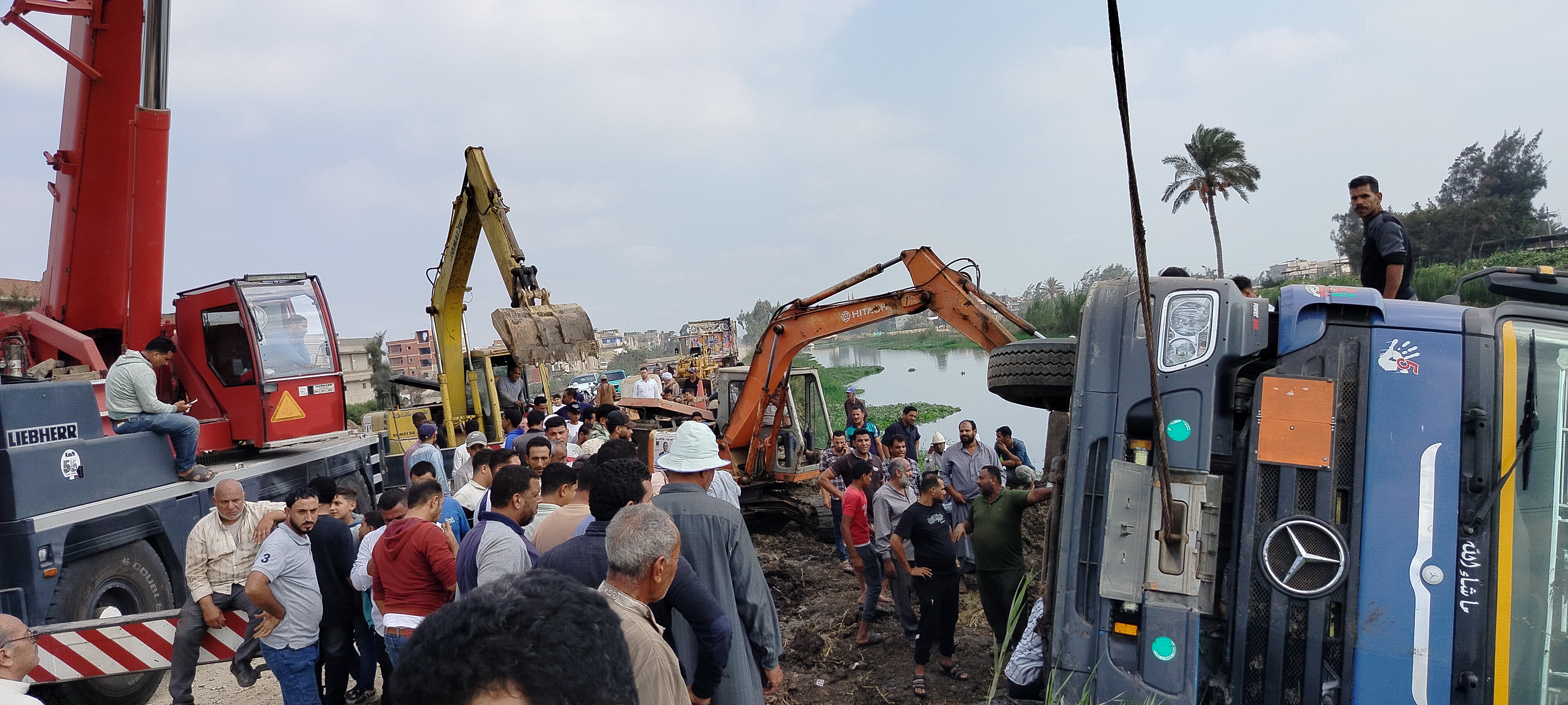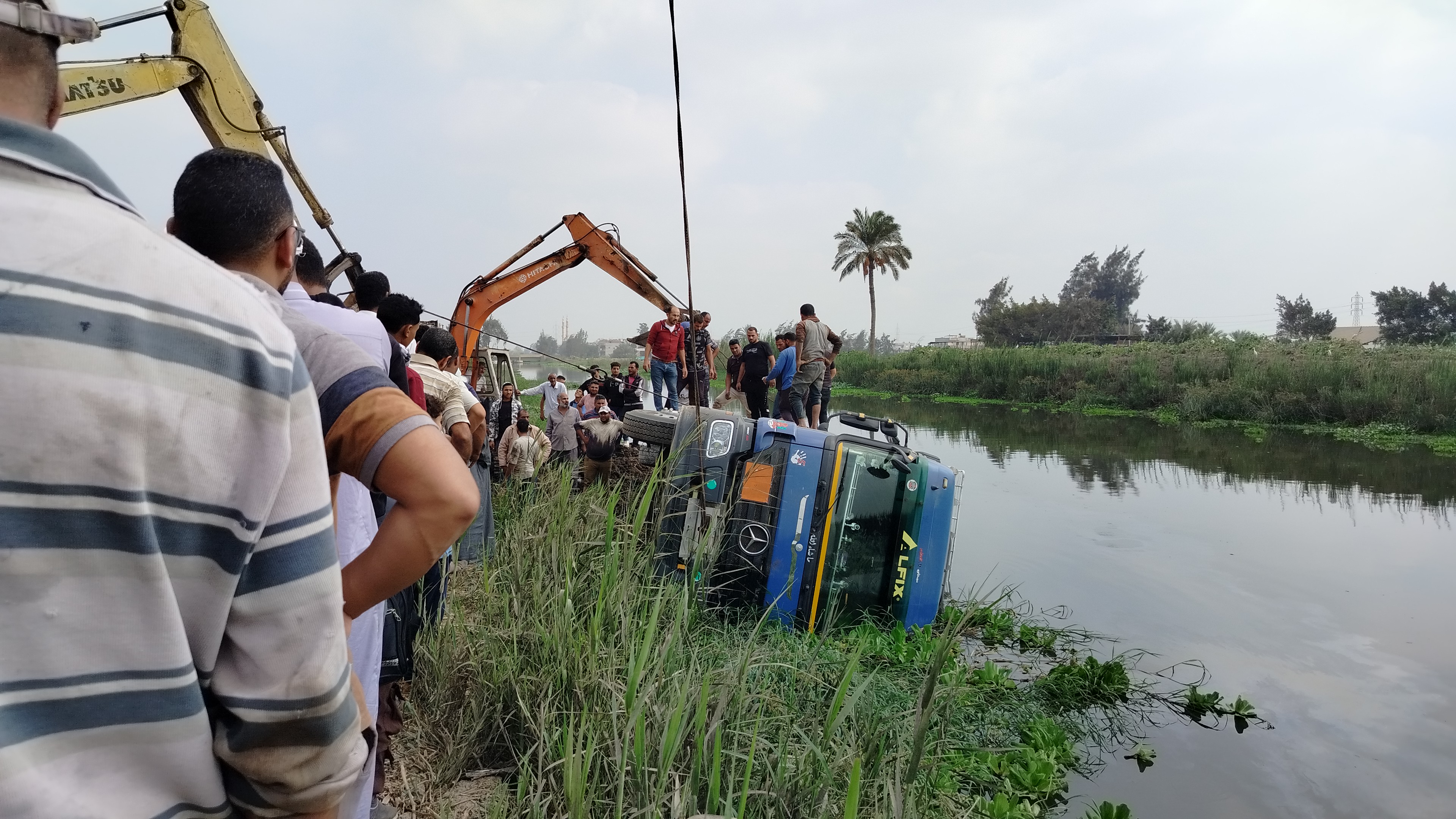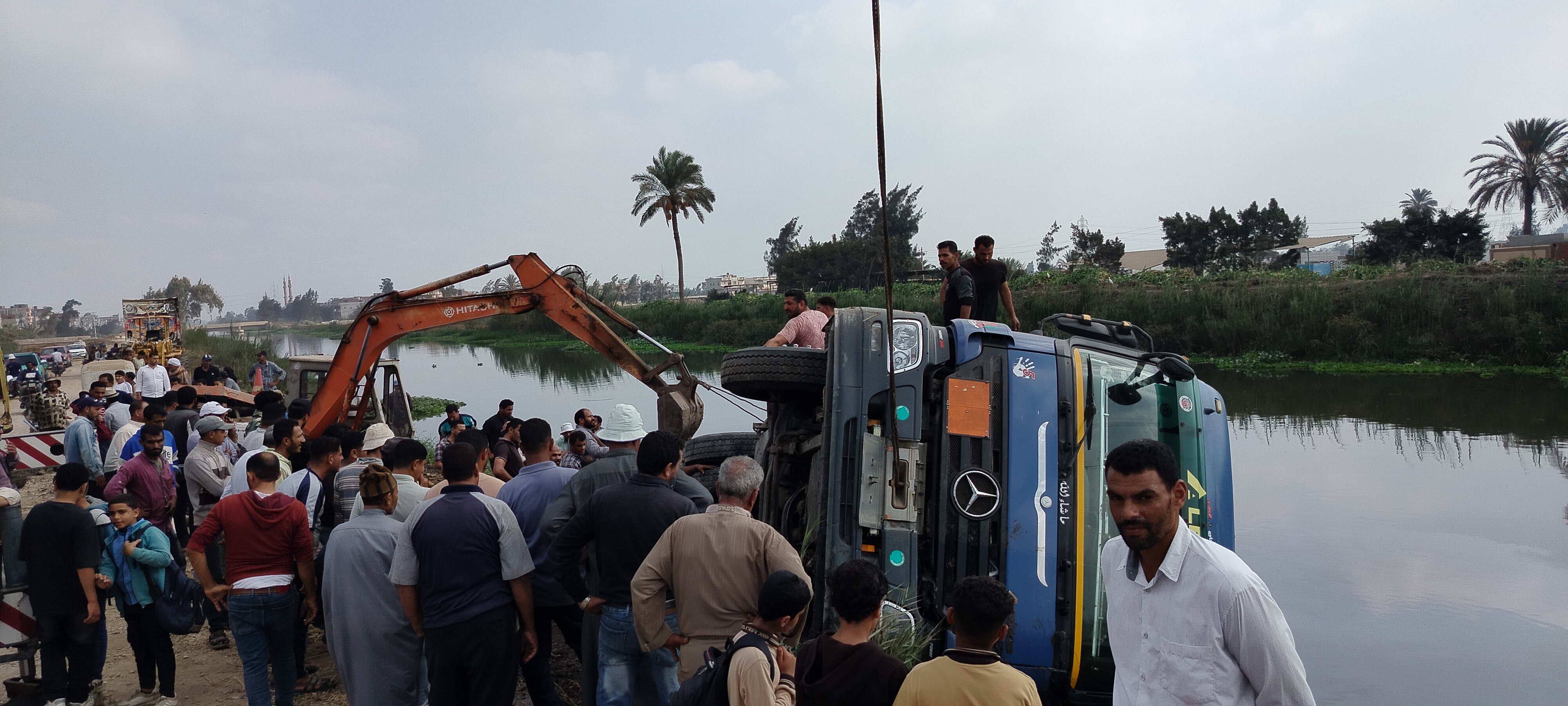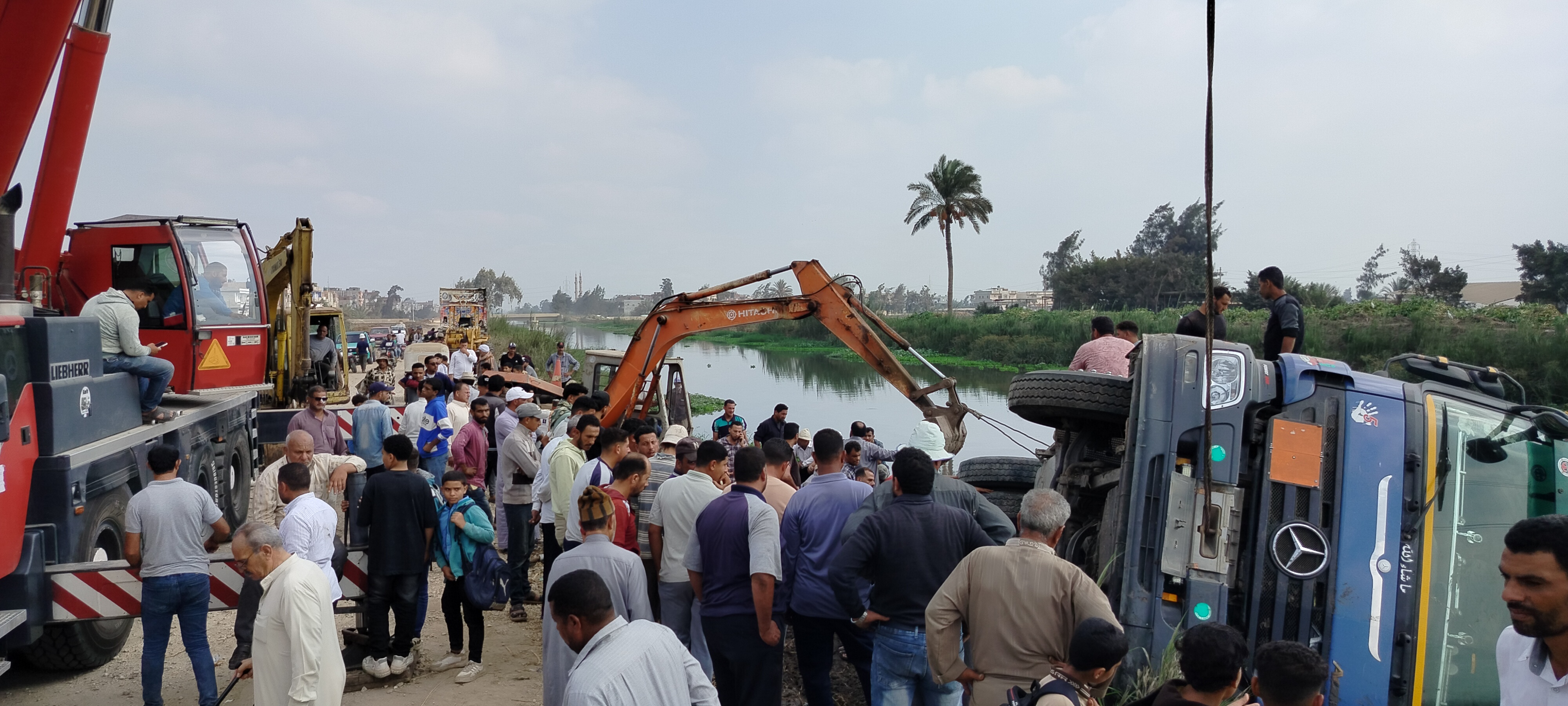 انقلاب سيارة نقل ثقيل داخل مصرف عموم البحيرة في دكرنس بالدقهلية