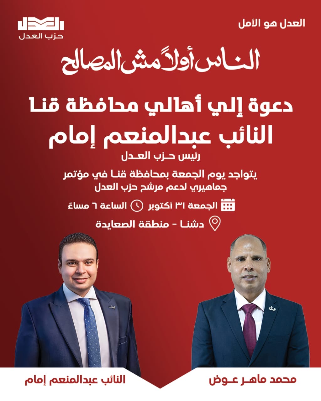 حزب العدل يعقد مؤتمرات جماهيرية فى بولاق وقنا لمرشحيه بحضور عبد المنعم إمام