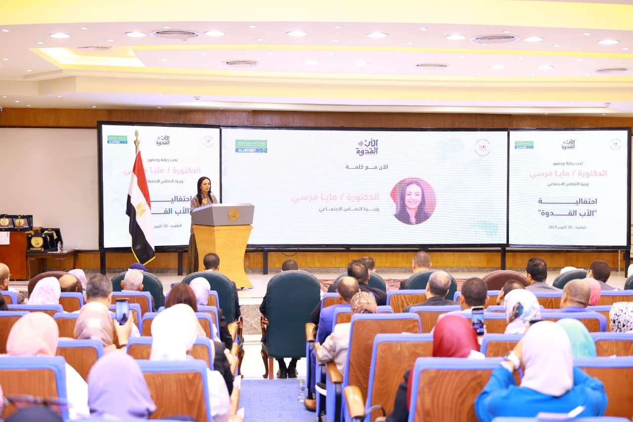تحت سقف وزارة كتبت تاريخها المشرف لثماني عقود، وتستمر وتزدهر، حتى احتضنت احتفالي جناحي الأسرة، الأم والأب، واليوم في هذه المناسبة الغالية نجتمع فيها للاحتفاء بـ "الأب القدوة" ودوره الريادي في الأسرة والمجتمع، لنؤكد معًا أن الأب قدوة حقيقة لأبنائه ونموذج للتربية السليمة، ولا تظنوا أن السيدة التي تقف هنا اليوم، ووقفت لعشر سنوات مسئولة عن المرأة المصرية، أنها لا تنحاز للأب، ولا تؤمن بدوره، فوجود الأب والأم معًا في تربية الأجيال، هو ما يضمن أسرة مصرية متماسكة تساهم في بناء مجتمع صحي قوي نفسيًا وأخلاقيًا، الأب والأم عمودان من الدعم لأبنائهما، قامت عليهما كل عناصر التربية الإيجابية في كل الأنحاء، وضعهما الله في كلمة واحدة ساحرة، كاشفة لكلٍ المعاني من الوحدة والتآلف "الوالدين"، فعملهما يدًا بيد في التربية كشجرة ظليلة للبيت تثمر أجيالًا تغذي مجمعاتنا وبلادنا بالأخلاق والقيم، فتحيةً لكل أب مصري يزرع القيم والأمل في نفوس أبنائه، وتحية تقدير واحترام لكل الأمهات والآباء في هذا الجمع الكريم.