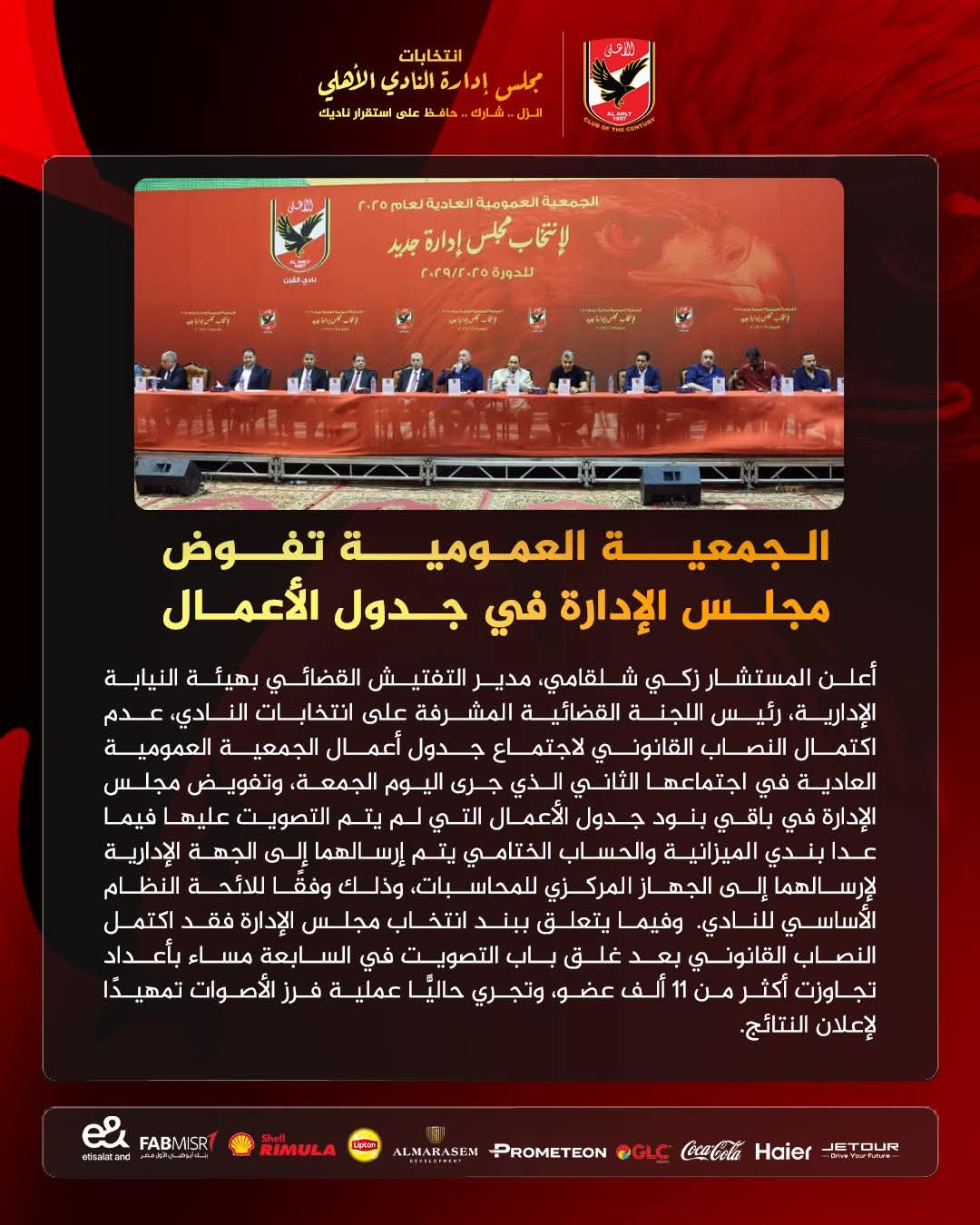 باستثناء بندي الميزانية والحساب الختامي.. الجمعية العمومية للنادي الأهلي تفوض مجلس الإدارة الجديد في باقي بنود جدول الأعمال
