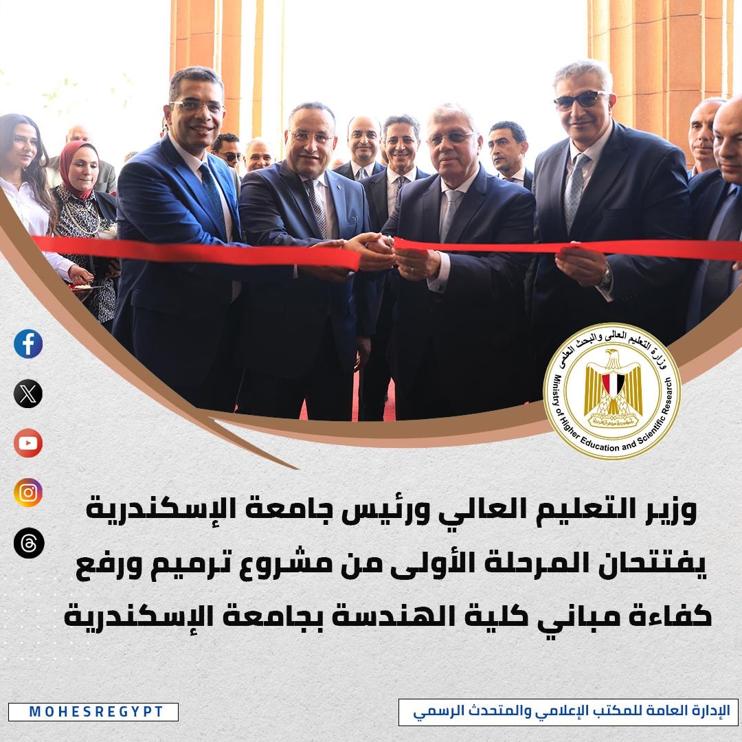 افتتح الدكتور أيمن عاشور، وزير التعليم العالي والبحث العلمي، المرحلة الأولى من أعمال ترميم ورفع كفاءة مباني كلية الهندسة بجامعة الإسكندرية، وأكد الدكتور أيمن عاشور أهمية تنفيذ مشروعات تطوير ورفع كفاءة المباني الجامعية لدعم جهود الارتقاء بالمنظومة التعليمية وتوفير بيئة تعليمية مُتميزة ومحفزة للطلاب على الإبداع والتميز.