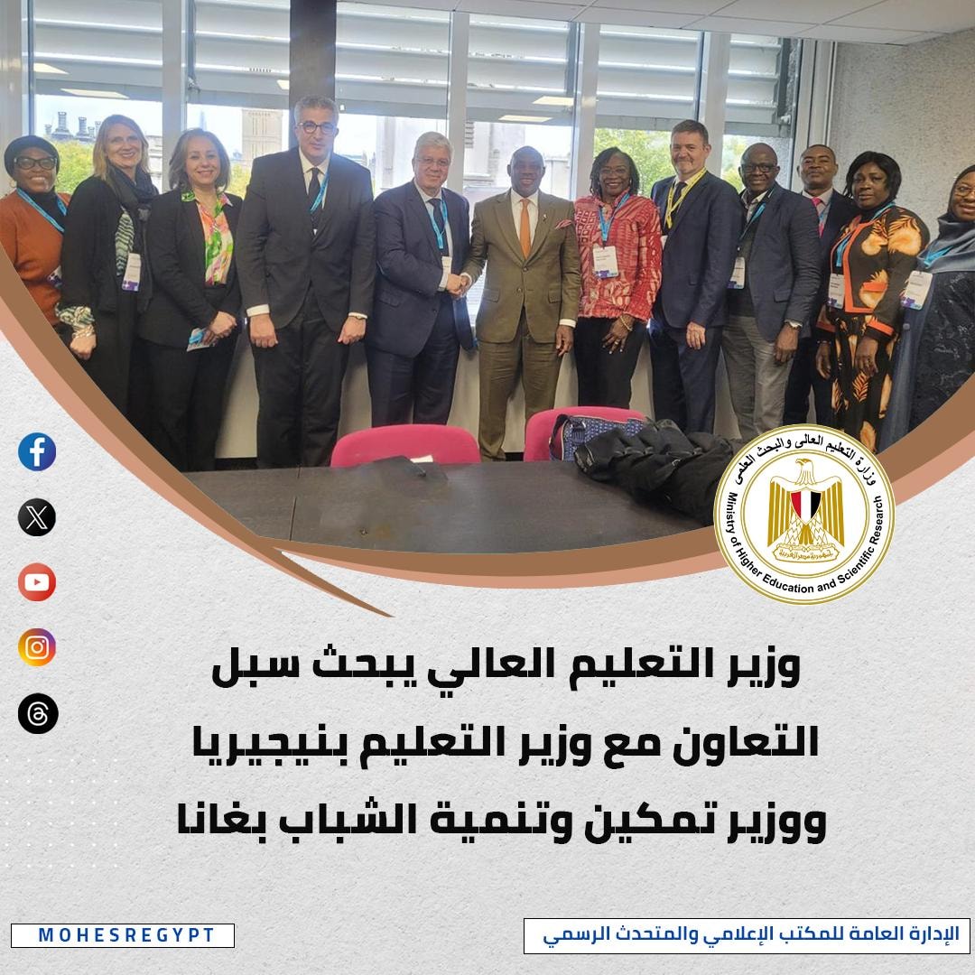 عقد الدكتور أيمن عاشور وزير التعليم العالي والبحث العلمي، اجتماعًا مع السيد/ موروفو أولاتونجي ألوسا، وزير التعليم بدولة نيجيريا، والسيد/ جورج أوباري أدو، وزير تمكين وتنمية الشباب بدولة غانا، لبحث سبل التعاون المشترك، وتناول الاجتماع العديد من الموضوعات الهامة، حيث تم تسليط الضوء على التطور الكبير في التعليم الرقمي والتعليم العابر للحدود، وكذلك التعليم الفني والتكنولوجي في مصر، وأكد الوزير ترحيب مصر باستقبال الطلاب من دولتي غانا ونيجيريا للدراسة في الجامعات المصرية.
