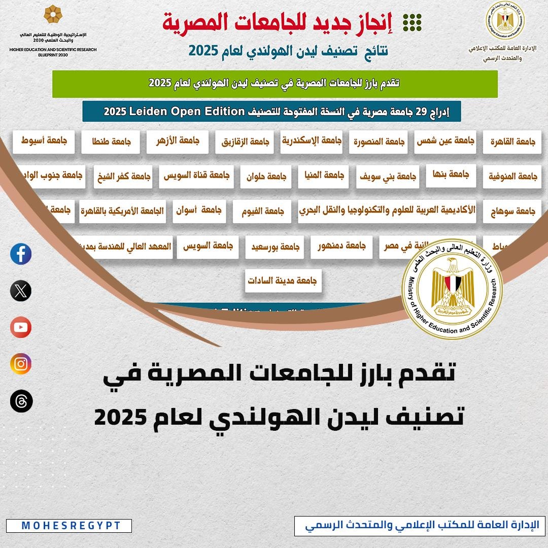 أعلن تصنيف ليدن (CWTS Leiden Ranking) الهولندي نتائجه الجديدة لعام 2025، والتي أظهرت تقدمًا ملحوظًا للجامعات المصرية، وذلك في إطار التقدم المستمر الذي تُحققه الجامعات المصرية في مختلف التصنيفات الدولية المرموقة، ويعتمد تصنيف ليدن لعام 2025 على منهجيتين رئيسيتين؛ الأولى هي النسخة التقليدية CWTS Leiden Ranking Traditional Edition 2025 التي تعتمد على بيانات منصة Web of Science، وقد تم إدراج 15 جامعة مصرية بها، أما المنهجية الثانية فهي النسخة المفتوحة CWTS Leiden Ranking Open Edition 2025، والتي أُطلقت منذ عامين وتعتمد على بيانات منصة OpenAlex، وقد شهدت إدراج 29 جامعة مصرية ضمن 2800 جامعة عالمية.