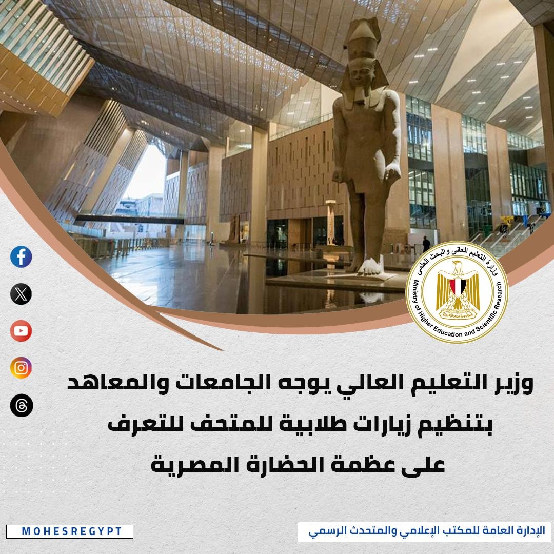 أكد د.أيمن عاشور وزير التعليم العالي والبحث العلمي أن افتتاح المتحف المصري الكبير يعد حدثًا تاريخيًّا ومرحلة جديدة في سجل إنجازات الدولة المصرية المعاصرة ، مشيرًا إلى أنه يمثل أحد أبرز المشروعات القومية والحضارية التي تبنتها الدولة بقيادة السيد الرئيس عبد الفتاح السيسي، ليكون صرحًا عالميًّا تقدمه مصر هدية إلى الإنسانية جمعاء، ويجسد عظمة الحضارة المصرية الخالدة، ووجه الوزير الجامعات والمعاهد المصرية بتنظيم زيارات ميدانية للمتحف المصري الكبير عقب افتتاحه رسميًّا؛ بهدف تعريف الطلاب بعظمة حضارتهم العريقة، وربطهم بجذورهم الثقافية، وتنمية وعيهم بأهمية صون التراث المصري الذي يعد جزءًا أصيلا من الهوية الوطنية والإنسانية.