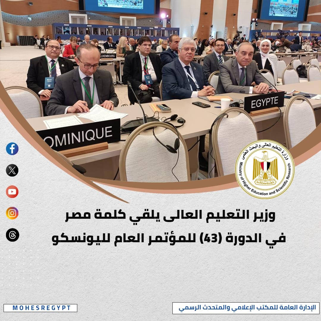 ألقى د.أيمن عاشور وزير التعليم العالي والبحث العلمي، كلمة مصر أمام الدورة الثالثة والأربعين للمؤتمر العام لمنظمة الأمم المتحدة للتربية والعلم والثقافة (اليونسكو) في مدينة سمرقند بجمهورية أوزبكستان، وأكد الوزير أن التعاون بين مصر واليونسكو شهد خلال العامين الماضيين تطورات إيجابية، من أبرزها دعم المجلس التنفيذي لمبادرة التكيف والصمود في مجال المياه (AWARe) وإدماجها ضمن البرنامج الحكومي الدولي للمياه (IHP)، ومشاركة مصر في إحياء برنامج FRIEND-Nile كما اعتمد المجلس قرار "بنك المعرفة المصري"، وزارت وفود دولية مصر في مايو 2024 للاطلاع على تجربته، إلى جانب توقيع اتفاقية بين مصر واليونسكو؛ لدعم التعاون الأكاديمي في الهندسة المعمارية والتخطيط الحضري، شملت إنشاء الأكاديمية الدولية لتعزيز الاستدامة البيئية ودعم جهود إعادة الإعمار في مناطق النزاعات بإفريقيا والشرق الأوسط.