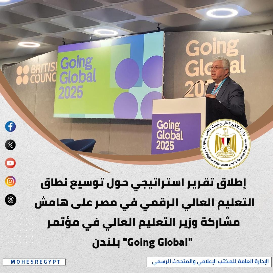 عقد الدكتور أيمن عاشور، وزير التعليم العالي والبحث العلمي، سلسلة من اللقاءات الهامة، خلال زيارته للعاصمة البريطانية لندن، على هامش المشاركة المصرية الفاعلة في مؤتمر "Going Global" السنوي المعني بتدويل التعليم العالي، والتقى الوزير بعدد من الطلاب المصريين الدارسين في المملكة المتحدة، وأكد الوزير خلال اللقاء عمق العلاقات التاريخية بين مصر والمملكة المتحدة، مشيرًا إلى حرص الوزارة على تعزيز أطر التعاون الثنائي في مجالات التعليم العالي والبحث العلمي، كما استعرض رؤية الإستراتيجية الوطنية للتعليم العالي والبحث العلمي التي أُطلقت في مارس ٢٠٢٣، والمبنية على محاور رئيسية تشمل: (التكامل، والتخصصات البينية، والمشاركة، والاستدامة، والمرجعية الدولية، والاتصال، والابتكار وريادة الأعمال).