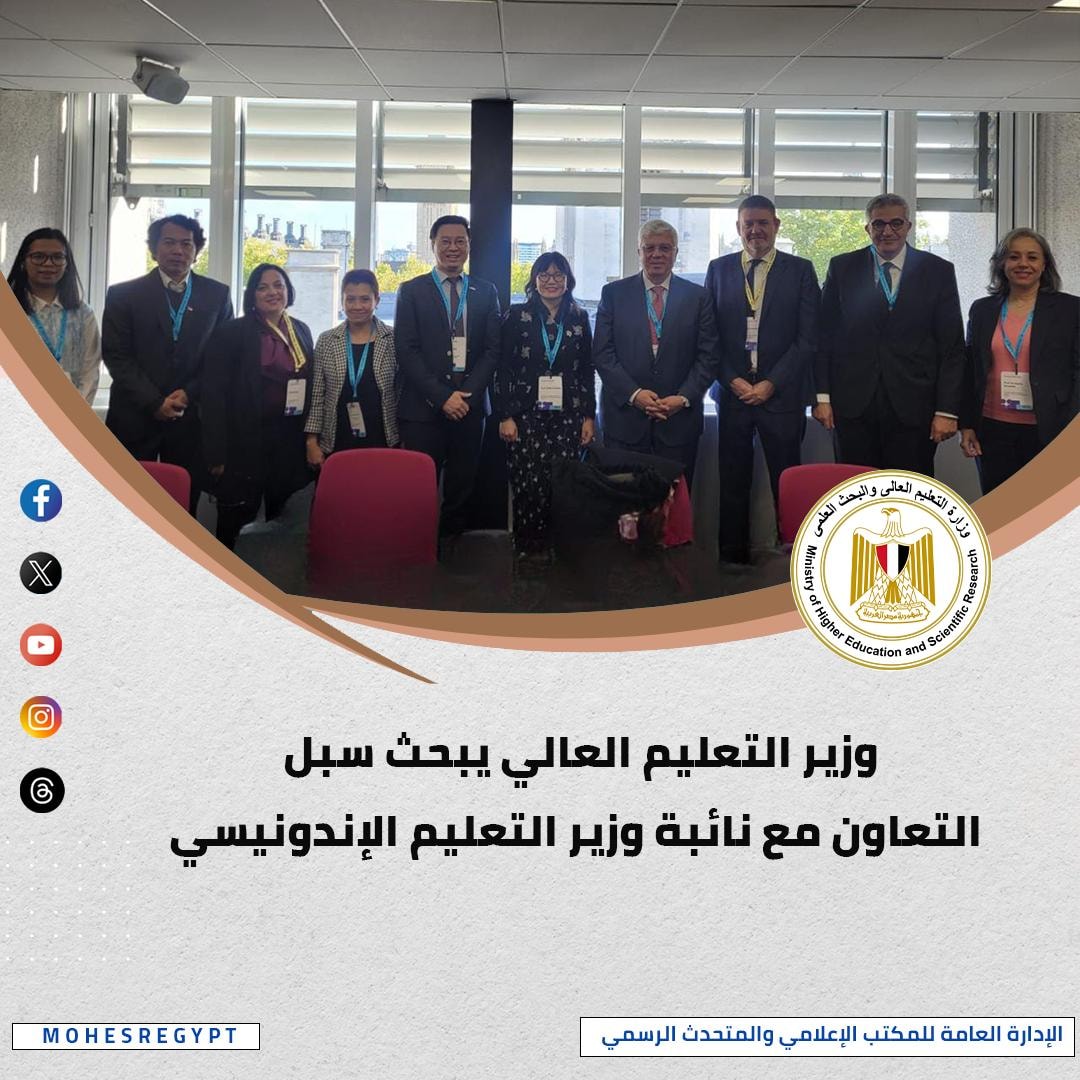 التقى الدكتور أيمن عاشور بالدكتورة ستيلا كريستي نائبة وزير التعليم الإندونيسي، حيث أبدت رغبتها في الاستفادة من تجربة مصر في "التعليم العابر للحدود" ورغبتها في التعاون مع وزارة التعليم العالي والبحث العلمي في مجالات بحثية مختلفة مرتبطة بتكنولوجيا الطاقة، والزراعة، والموارد الطبيعية الرئيسية مثل المعادن، وأشار الوزير إلى إمكانية زيادة التعاون بين الجانبين في مختلف المجالات ذات الاهتمام المشترك، مؤكدًا أهمية بناء قنوات تعاون متعددة وخاصة في مجالات البحث العلمي، والتشجيع على استقبال الهيئة المعاونة من الجامعات الإندونيسية لاستكمال الدراسات العليا بمصر.