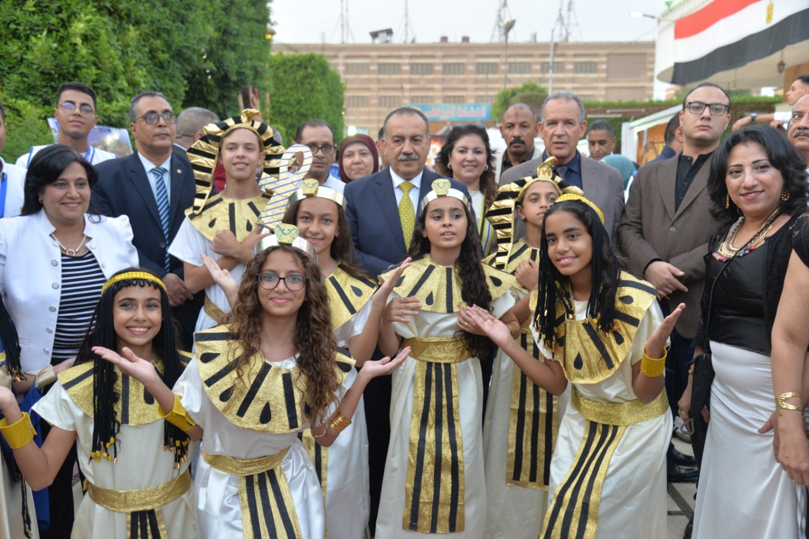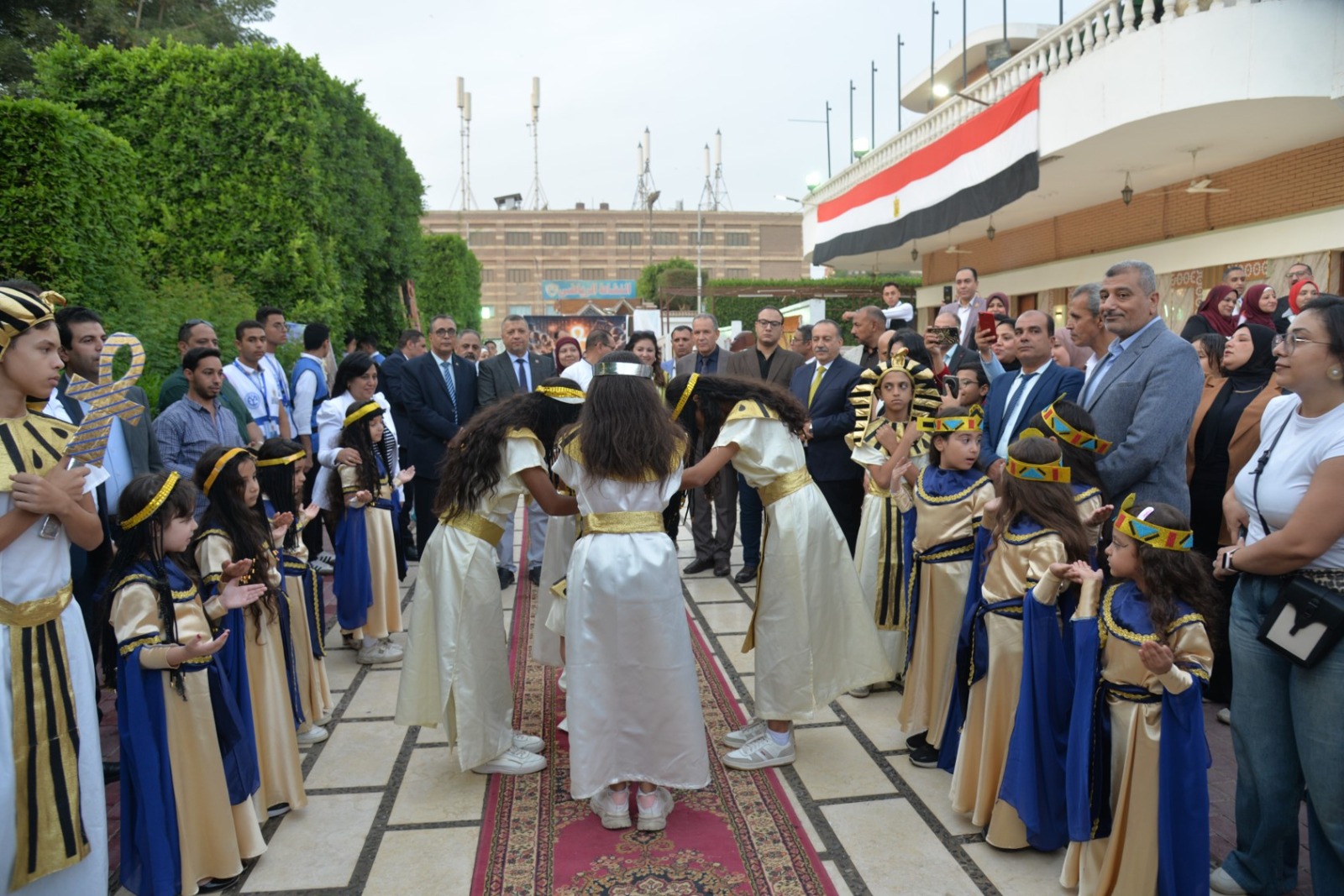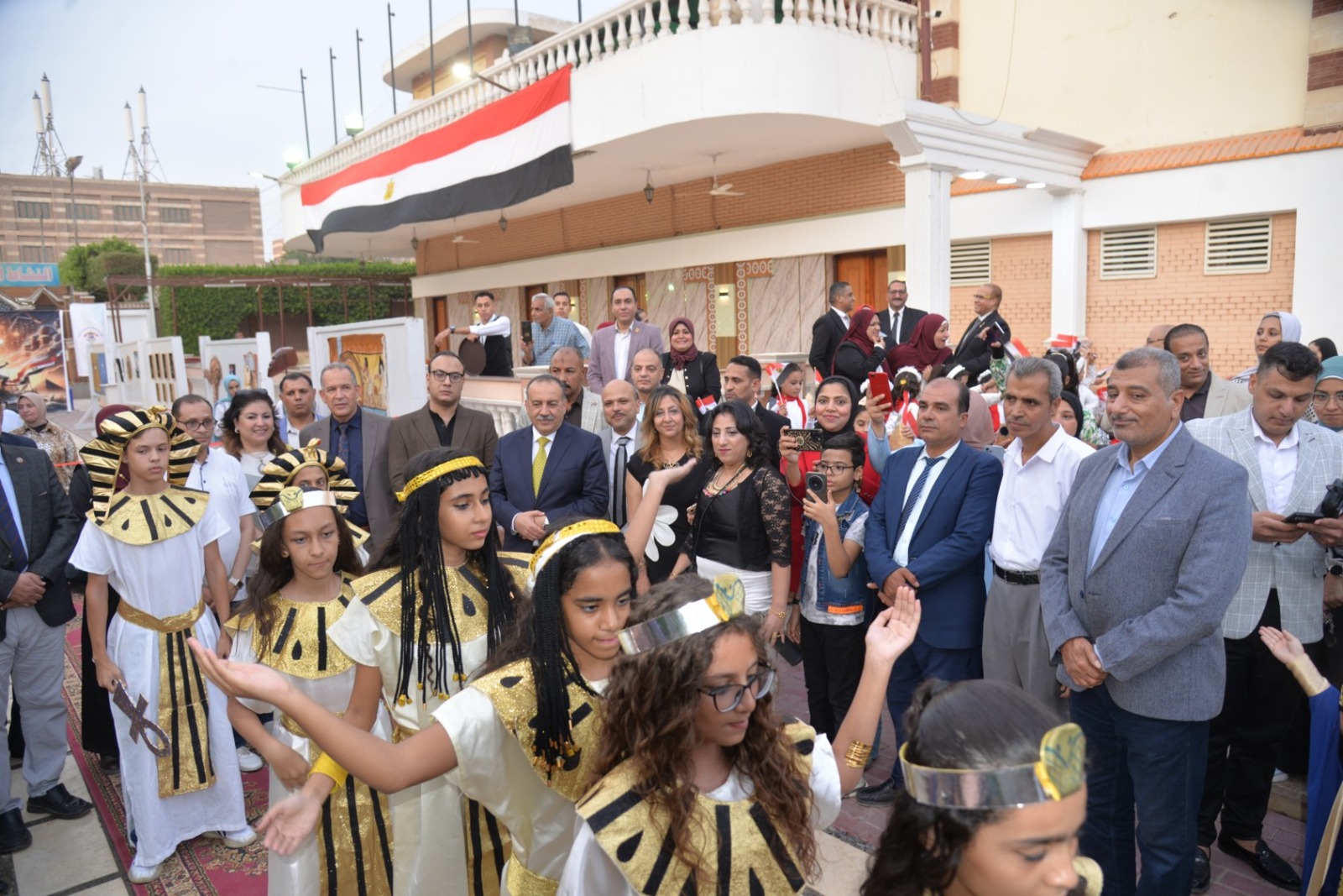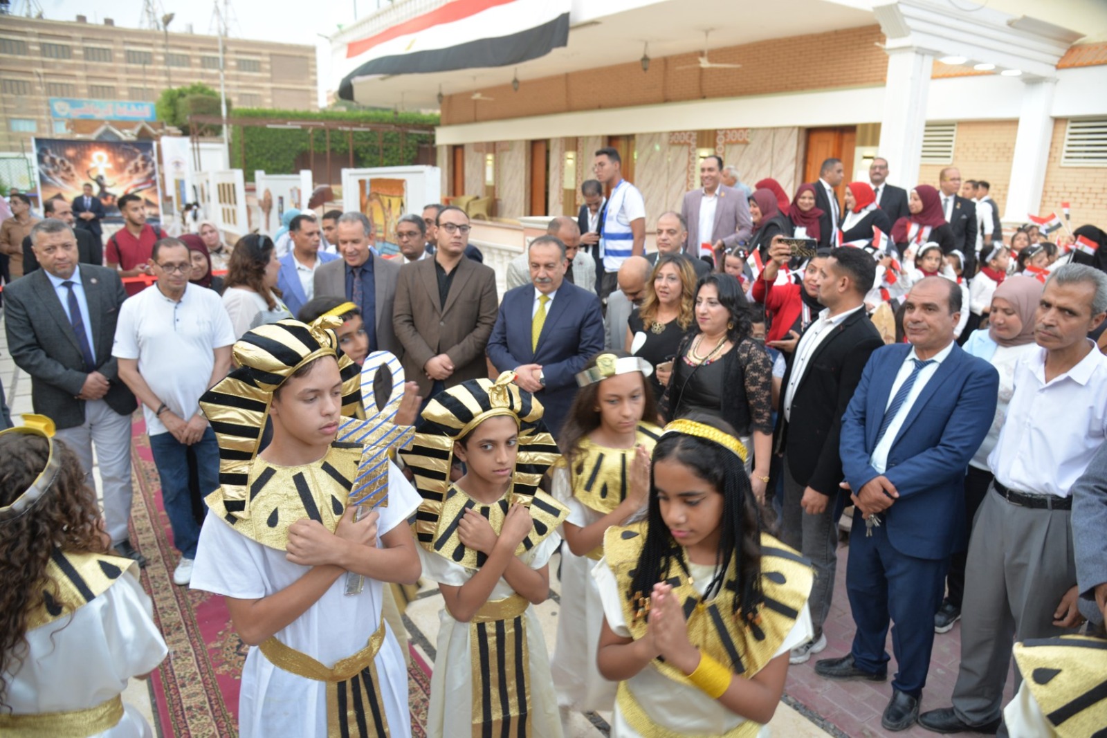 وانطلقت الفعاليات باستقبال المحافظ بطابور عرض فرعوني شارك فيه عشرات الأطفال وطلاب المدارس الحكومية والخاصة، مرتدين الأزياء الفرعونية التي عكست رموز الحضارة المصرية القديمة، مرددين الأغاني الوطنية وسط تصفيق الحضور، في مشهد نابض بالحياة عبّر عن روح الانتماء والفخر بتاريخ مصر المجيد.