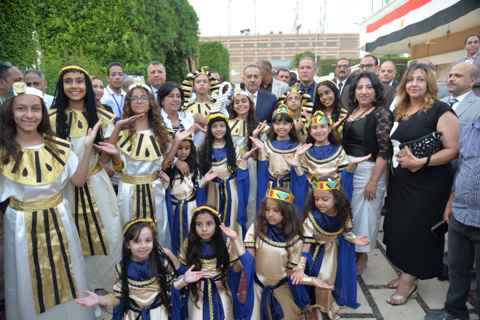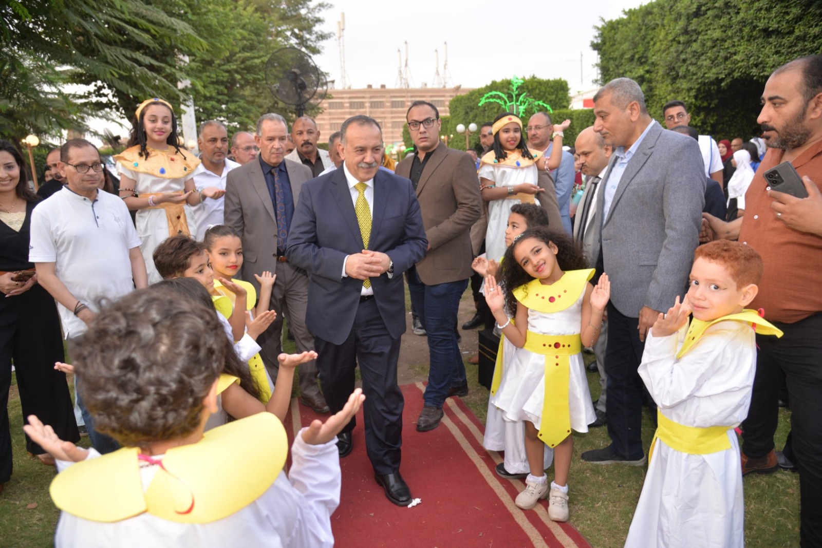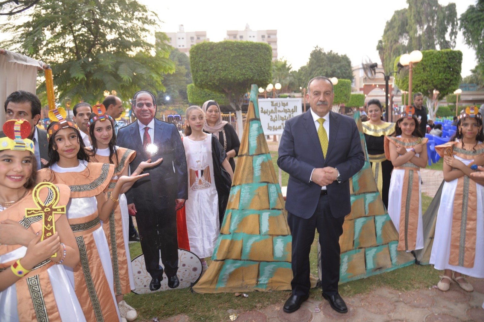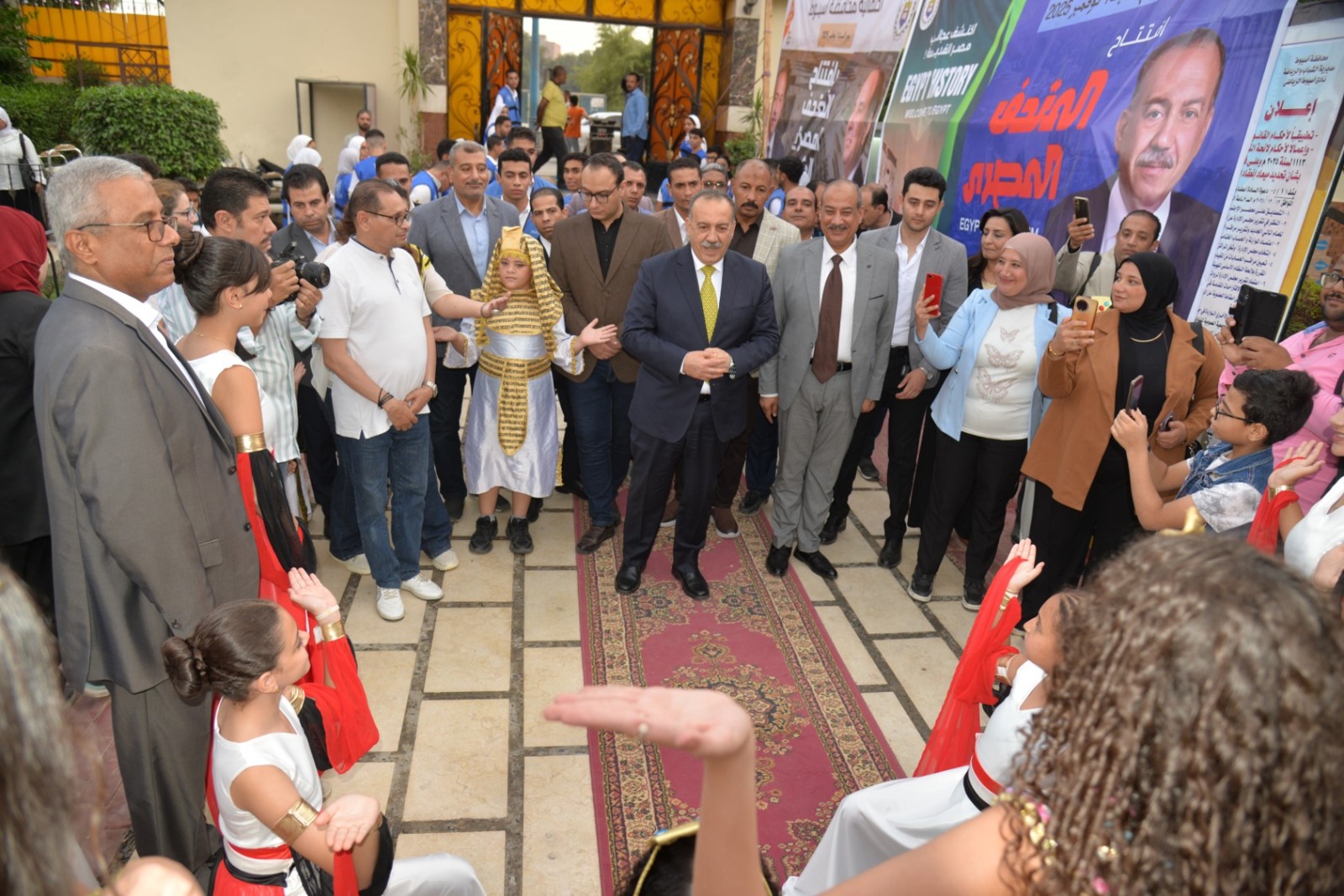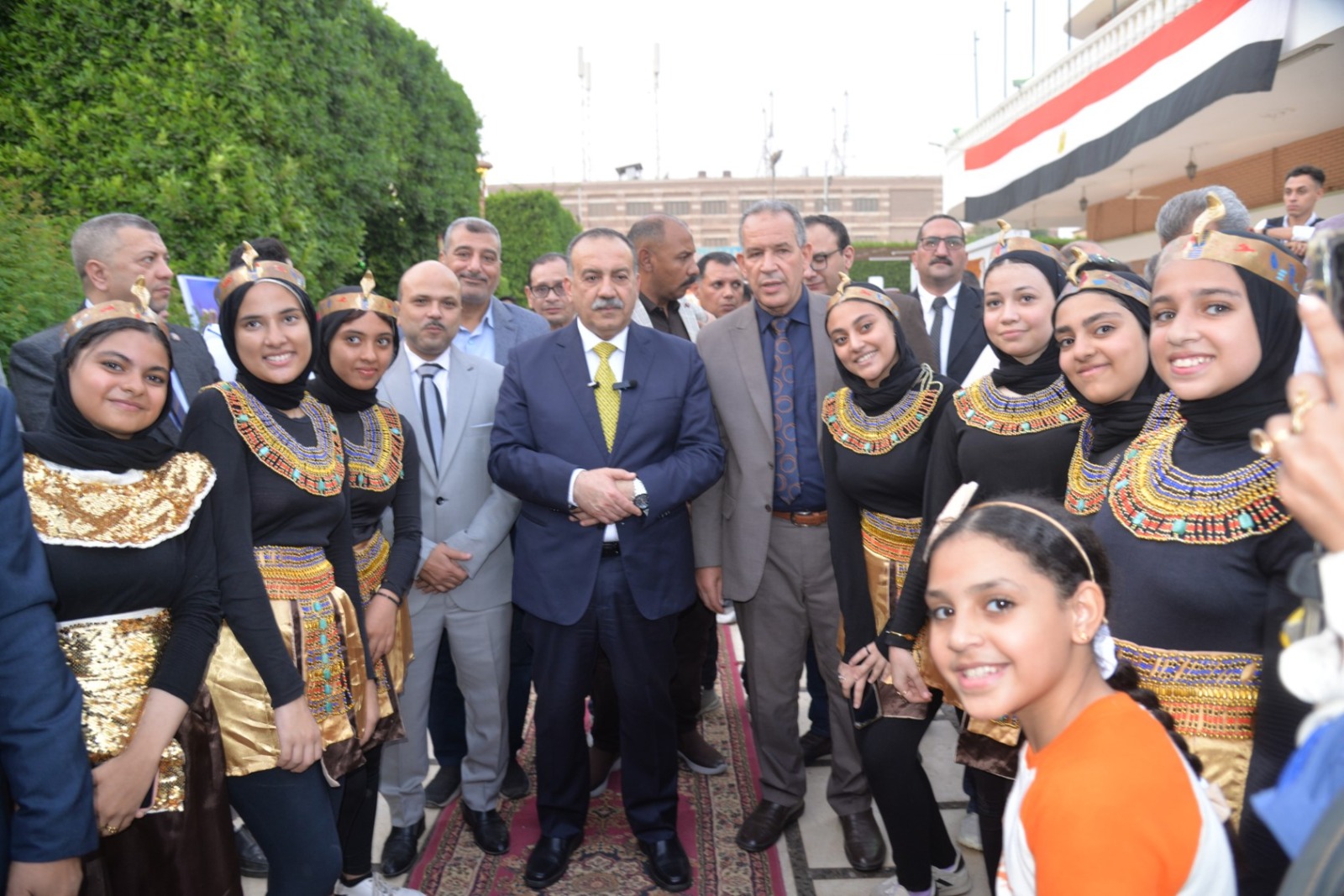 وانطلقت الفعاليات باستقبال المحافظ بطابور عرض فرعوني شارك فيه عشرات الأطفال وطلاب المدارس الحكومية والخاصة، مرتدين الأزياء الفرعونية التي عكست رموز الحضارة المصرية القديمة، مرددين الأغاني الوطنية وسط تصفيق الحضور، في مشهد نابض بالحياة عبّر عن روح الانتماء والفخر بتاريخ مصر المجيد.
