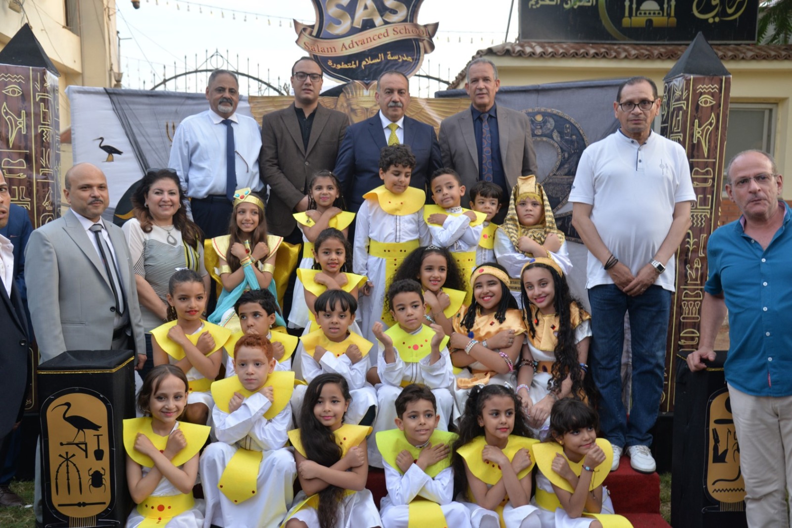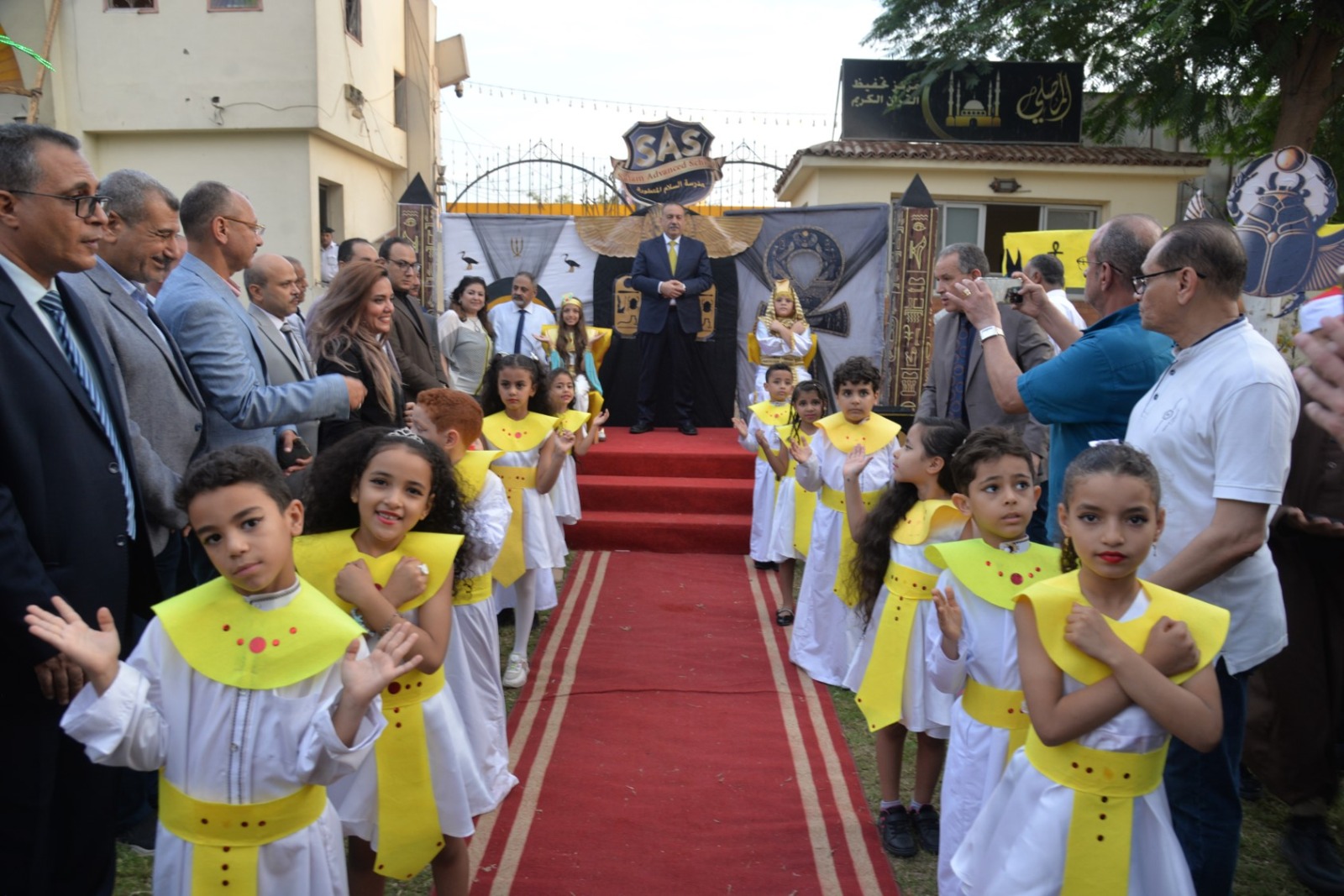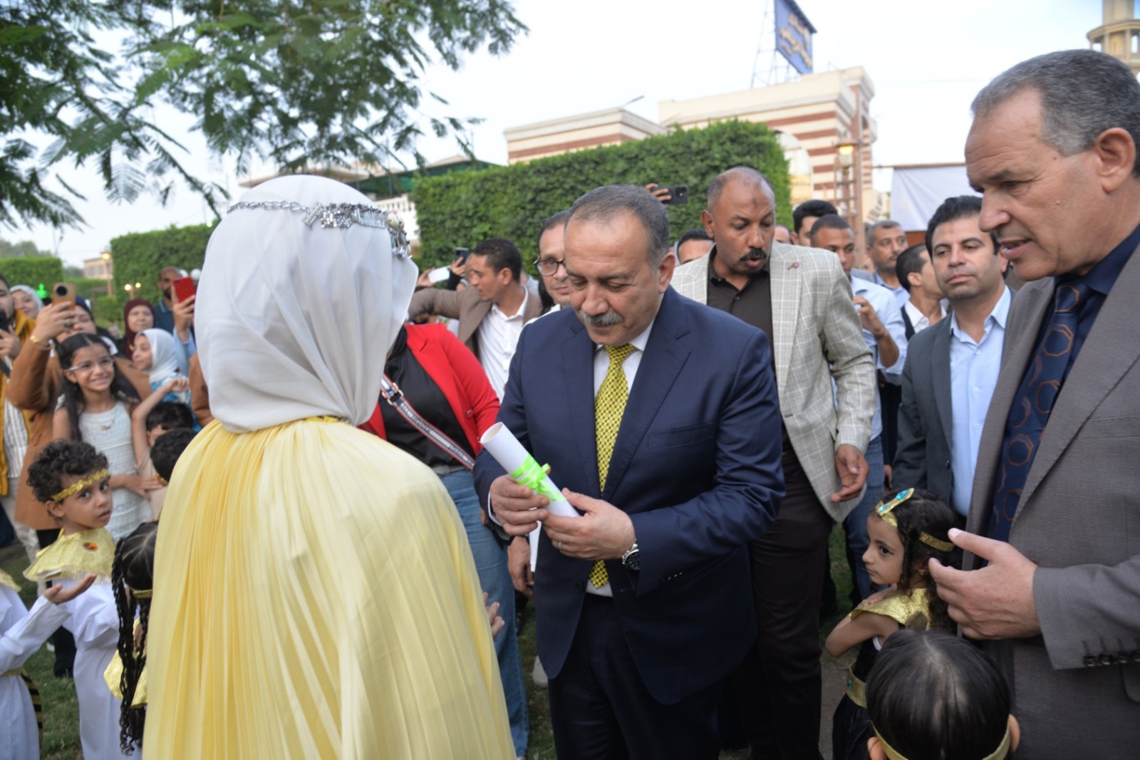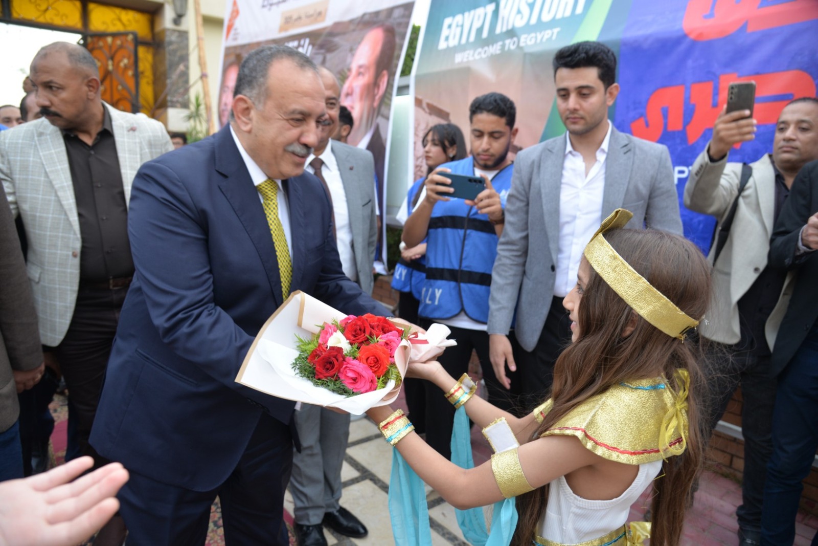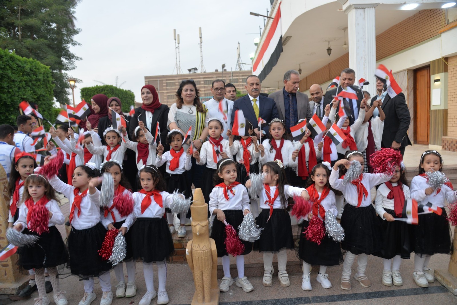 وانطلقت الفعاليات باستقبال المحافظ بطابور عرض فرعوني شارك فيه عشرات الأطفال وطلاب المدارس الحكومية والخاصة، مرتدين الأزياء الفرعونية التي عكست رموز الحضارة المصرية القديمة، مرددين الأغاني الوطنية وسط تصفيق الحضور، في مشهد نابض بالحياة عبّر عن روح الانتماء والفخر بتاريخ مصر المجيد.