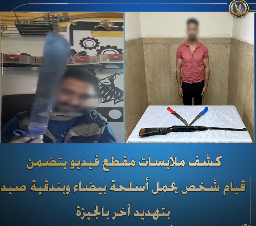 فى إطار كشف ملابسات مقطع فيديو تم تداوله بمواقع التواصل الإجتماعى يتضمن قيام شخص يحمل أسلحة بيضاء وبندقية صيد بتهديد آخر بالجيزة.