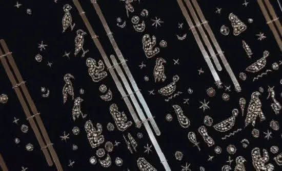 فستان رقيق من اللون الاسود تعلوة نقوش وزخارف فرعونية منتقاة بعنايه فائقة لتشكل جملة "ينحني الزمان أمام عظمة مصر "مطرز بالكامل باللون الذهبي يتلائم مع اللون الاسود