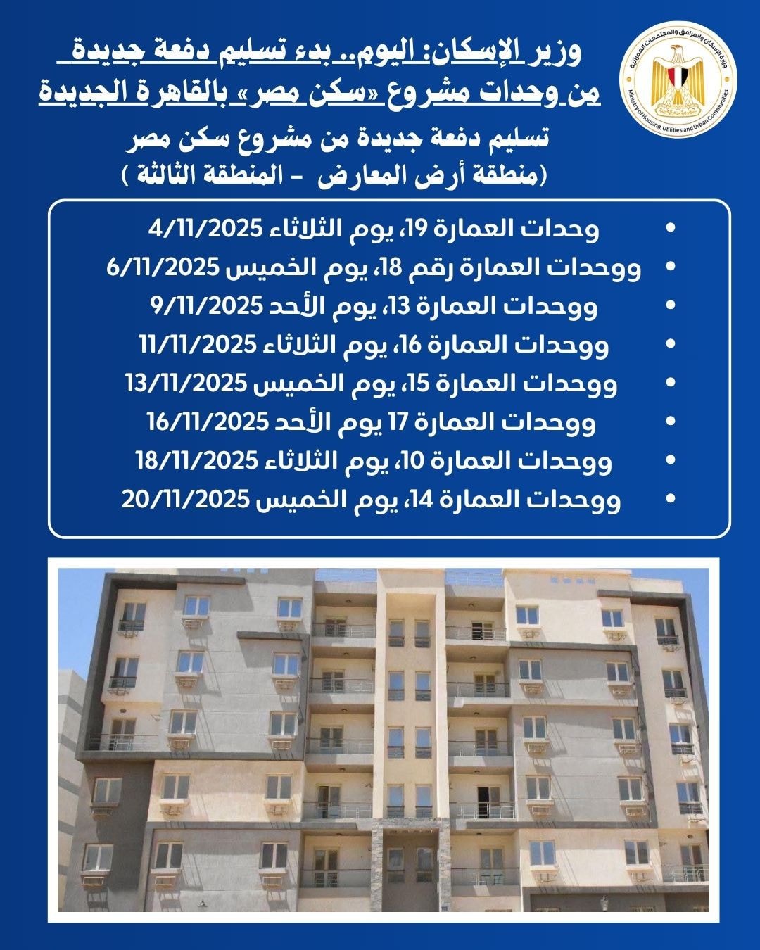 وأوضح المهندس أحمد رشاد، رئيس جهاز تنمية مدينة القاهرة الجديدة، أنه سيتم تسليم دفعة جديدة من مشروع سكن مصر (منطقة أرض المعارض - المنطقة الثالثة )، حيث سيتم تسليم وحدات العمارة 19، يوم الثلاثاء 4/11/2025، ووحدات العمارة رقم 18، يوم الخميس 6/11/2025، ووحدات العمارة 13، يوم الأحد 9/11/2025، ووحدات العمارة 16، يوم الثلاثاء 11/11/2025، ووحدات العمارة 15، يوم الخميس 13/11/2025، ووحدات العمارة 17 يوم الأحد 16/11/2025، ووحدات العمارة 10، يوم الثلاثاء 18/11/2025، ووحدات العمارة 14، يوم الخميس 20/11/2025.