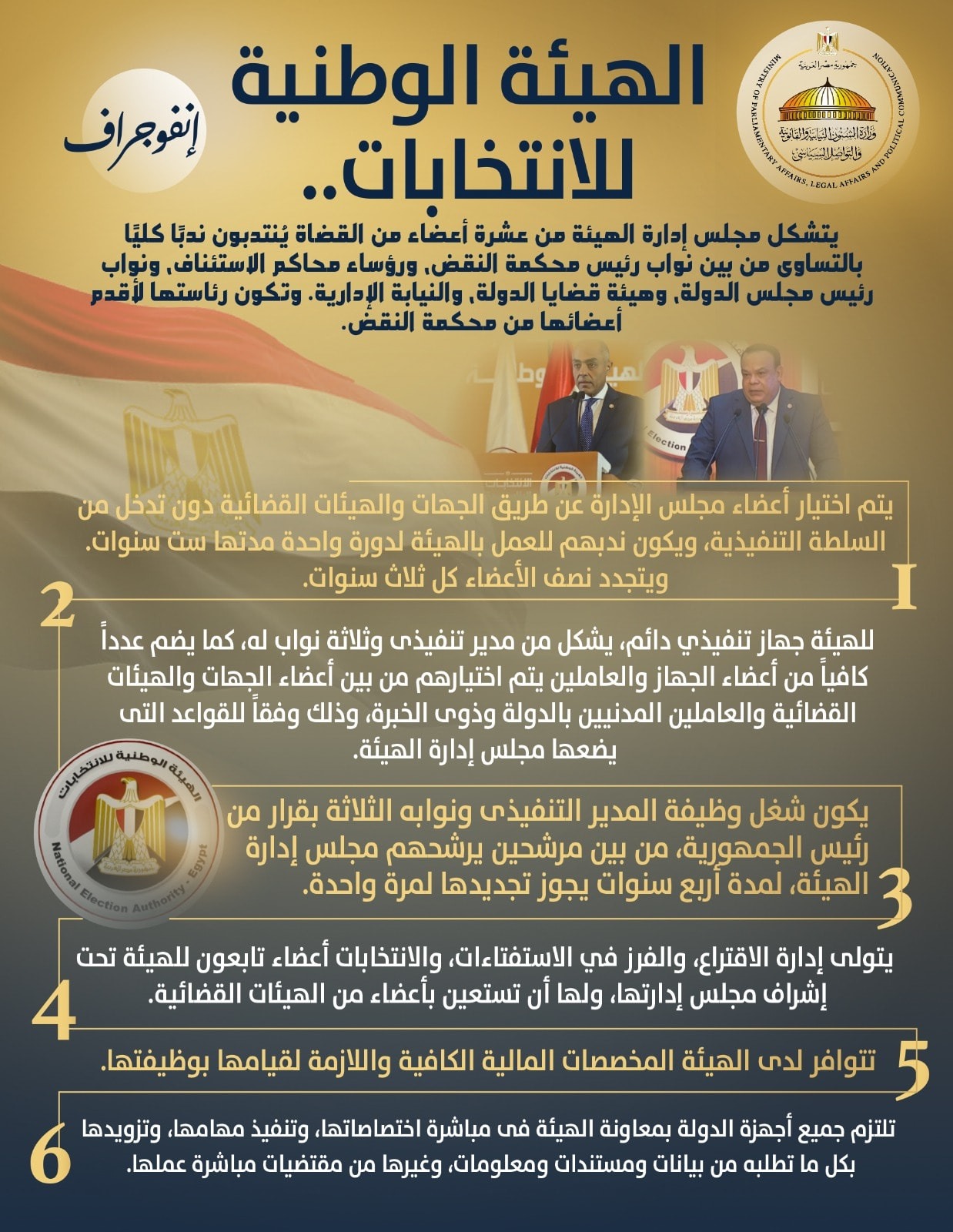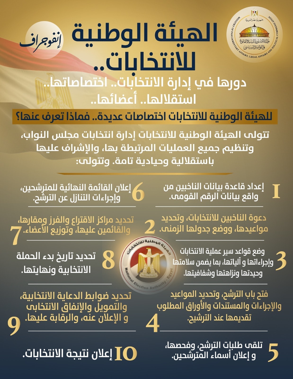 أصدرت وزارة الشؤون النيابية والقانونية والتواصل السياسي بيانًا، اليوم الخميس، قالت فيه إنها في إطار استمرار الدور الذي تقوم به في زيادة الوعي الانتخابي، وفي إطار تفعيل جانب التواصل السياسي، فإنها تنشر اليوم إنفوجرافًا لتعريف المواطنين بالهيئة الوطنية للانتخابات.. دورها في إدارة الانتخابات.. اختصاصاتها.. استقلالها.. أعضائها، وإنفوجرافًا ثان، يتعلق بكل المعلومات عن الدوائر الانتخابية.. العدد والتوزيع الجغرافي.