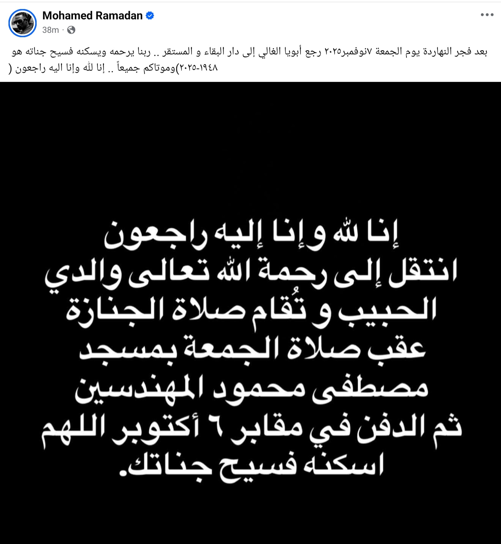 وكتب الفنان محمد رمضان على صفحته، "انتقل إلى رحمة الله تعالى والدي الحبيب، وستقام صلاة الجنازة عقب صلاة الجمعة بمسجد مصطفى محمود المهندسين، ثم الدفن بمقابر العائلة في 6 أكتوبر".