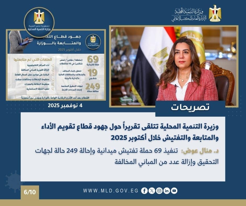 تلقت الدكتورة منال عوض وزيرة التنمية المحلية والقائم بأعمال وزير البيئة، تقريراً من قطاع تقويم الأداء والمتابعة والتفتيش بالوزارة برئاسة المهندس هيثم الدسوقي ، حول أبرز مجهودات القطاع خلال شهر أكتوبر 2025 في متابعة الأداء الميداني للوحدات المحلية بالمحافظات، وضبط منظومة العمل وتحسين الخدمات المقدمة للمواطنين، حيث تم تنفيذ 69 حملة تفتيش ميدانية في 10 محافظات وإحالة 249 حالة لجهات التحقيق وإزالة عدد من المباني المخالفة.