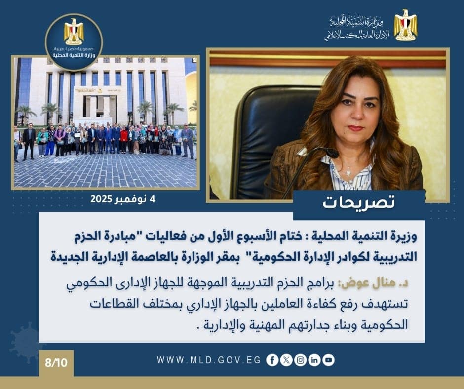 كما أعلنت الدكتورة منال عوض، وزيرة التنمية المحلية ، عن إنطلاق فعاليات الأسبوع التدريبي الثالث عشر من الخطة التدريبية السنوية لمركز التنمية المحلية بسقارة للعام 2025 / 2026، والمقرره خلال الفترة من 2 حتى 5 نوفمبر 2025، بتنفيذ 5 برامج تدريبية يستفيد منها 450 متدربًا من مختلف المحافظات، ضمن جهود الوزارة لبناء قدرات العاملين بالإدارة المحلية ورفع كفاءة الأداء في مختلف القطاعات الخدمية والتنموية.