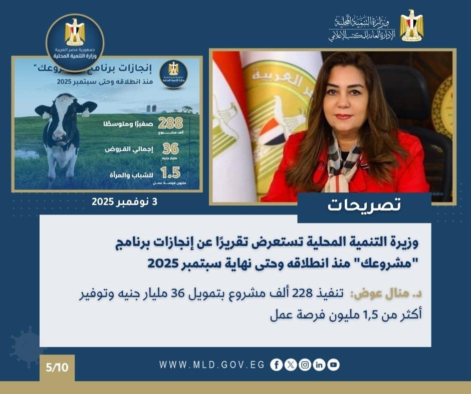 تلقت الدكتورة منال عوض وزيرة التنمية المحلية، تقريرًا حول إنجازات المشروع القومي للتنمية المجتمعية والبشرية والمحلية "مشروعك" منذ انطلاقه في عام 2015 وحتى نهاية شهر سبتمبر 2025، وذلك في إطار دعم الدولة للشباب والمرأة وتمكينهم اقتصاديًا، حيث ساهم مشروعك منذ انطلاقه وحتي نهاية شهر سبتمبر الماضي في تمويل نحو 228 ألف مشروع صغير ومتوسط بمختلف محافظات الجمهورية، بإجمالي قروض حوالي 36 مليار جنيه، مما وفر 1,5 مليون فرصة عمل مباشرة وغير مباشرة للشباب والمرأة في القرى والمراكز والمدن.