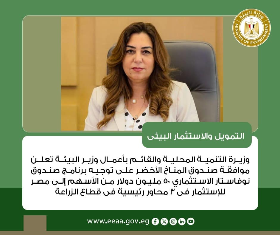 - وزيرة التنمية المحلية والقائم بأعمال وزير البيئة تعلن موافقة صندوق المناخ الأخضر خلال جلسته رقم ٤٣ المنعقدة بمدينة إنتشون بكوريا الجنوبية، على توجيه برنامج صندوق نوفاستار الاستثماري ٥٠ مليون دولار من الأسهم إلى مصر للإستثمار فى ٣ محاور رئيسية فى قطاع الزراعة، وهو صندوق رأس مال استثماري بقيمة ٢٠٠ مليون دولار من الأسهم، للمساهمة في تعبئة التمويل للمشروعات الإفريقية المعنية بالمناخ فى خمس دول على رأسها مصر.