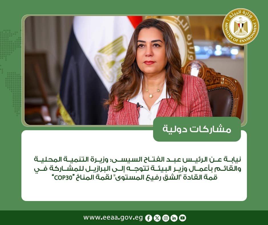 - نيابةً عن الرئيس السيسى، توجهت الدكتورة منال عوض وزيرة التنمية المحلية والقائم بأعمال وزير البيئة، إلى مدينة بيليم بجمهورية البرازيل الاتحادية، للمشاركة في قمة القادة "الشق رفيع المستوى" من فعاليات مؤتمر الأطراف الثلاثين لاتفاقية الأمم المتحدة الإطارية لتغير المناخ (COP30)، والمقرر عقدها بالفترة من 6 إلى 7 نوفمبر الجاري ، بمشاركة واسعة من رؤساء الدول والحكومات ووزراء البيئة والطاقة والمناخ بعدد من دول العالم، وممثلي المنظمات الدولية والإقليمية والمجتمع المدني.