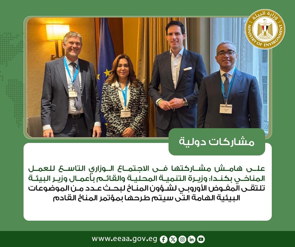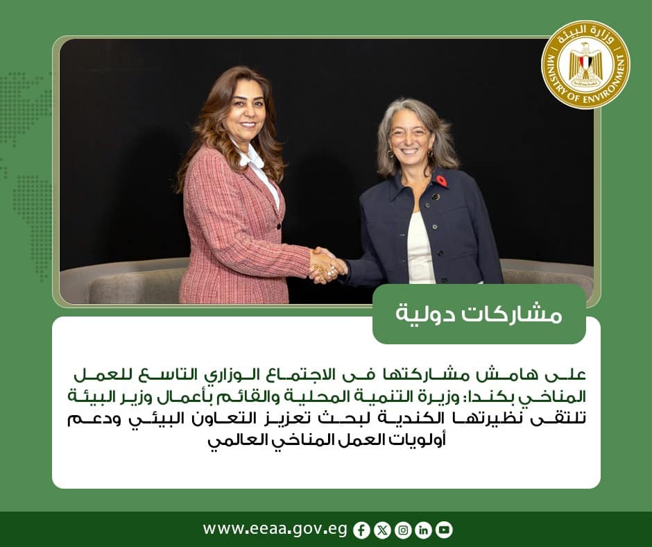 - على هامش مشاركتها فى الاجتماع الوزاري التاسع للعمل المناخي بكندا: عقدت الدكتورة منال عوض، وزيرة التنمية المحلية والقائم بأعمال وزير البيئة، لقاءا ثنائيًا مع السيدة جولي دابروسين، وزيرة البيئة وتغير المناخ في كندا، لبحث تعزيز التعاون البيئي ودعم أولويات العمل المناخي العالمي، وذلك على هامش مشاركتها في الاجتماع الوزاري التاسع للعمل المناخي بكندا، المنعقد خلال الفترة من 31 أكتوبر إلى 1 نوفمبر ٢٠٢٥ ، بمشاركة عدد من وزراء البيئة والمناخ من الاتحاد الأوروبي والصين وكندا والدول النامية. وزيرة التنمية المحلية والقائم بأعمال وزير البيئة تلتقى مع نظيرتها الكندية لبحث تعزيز التعاون البيئي ودعم أولويات العمل المناخي العالمي.