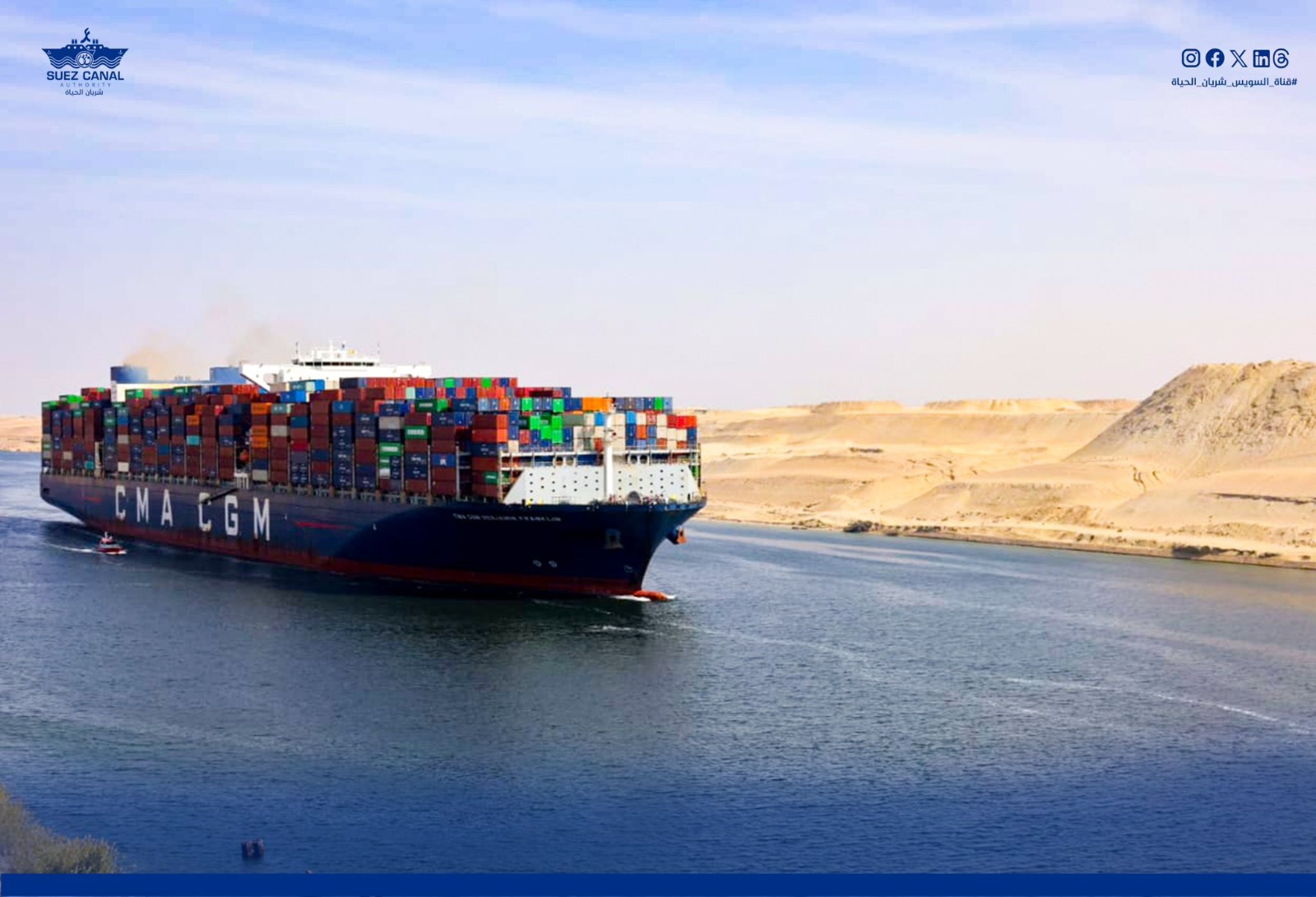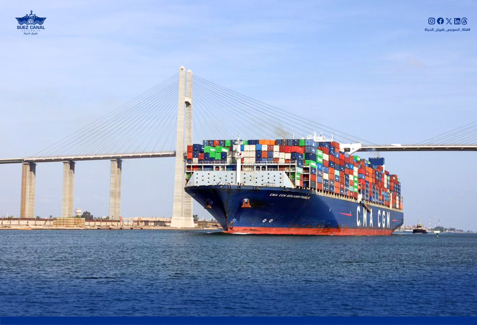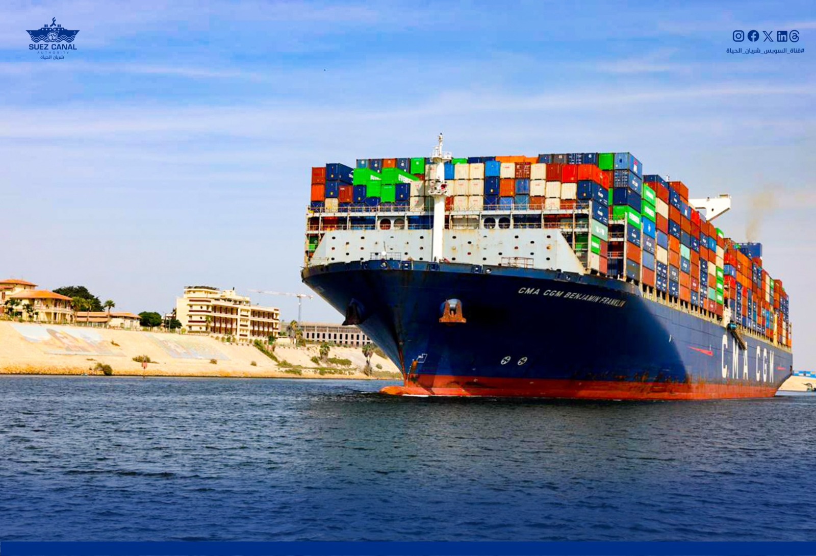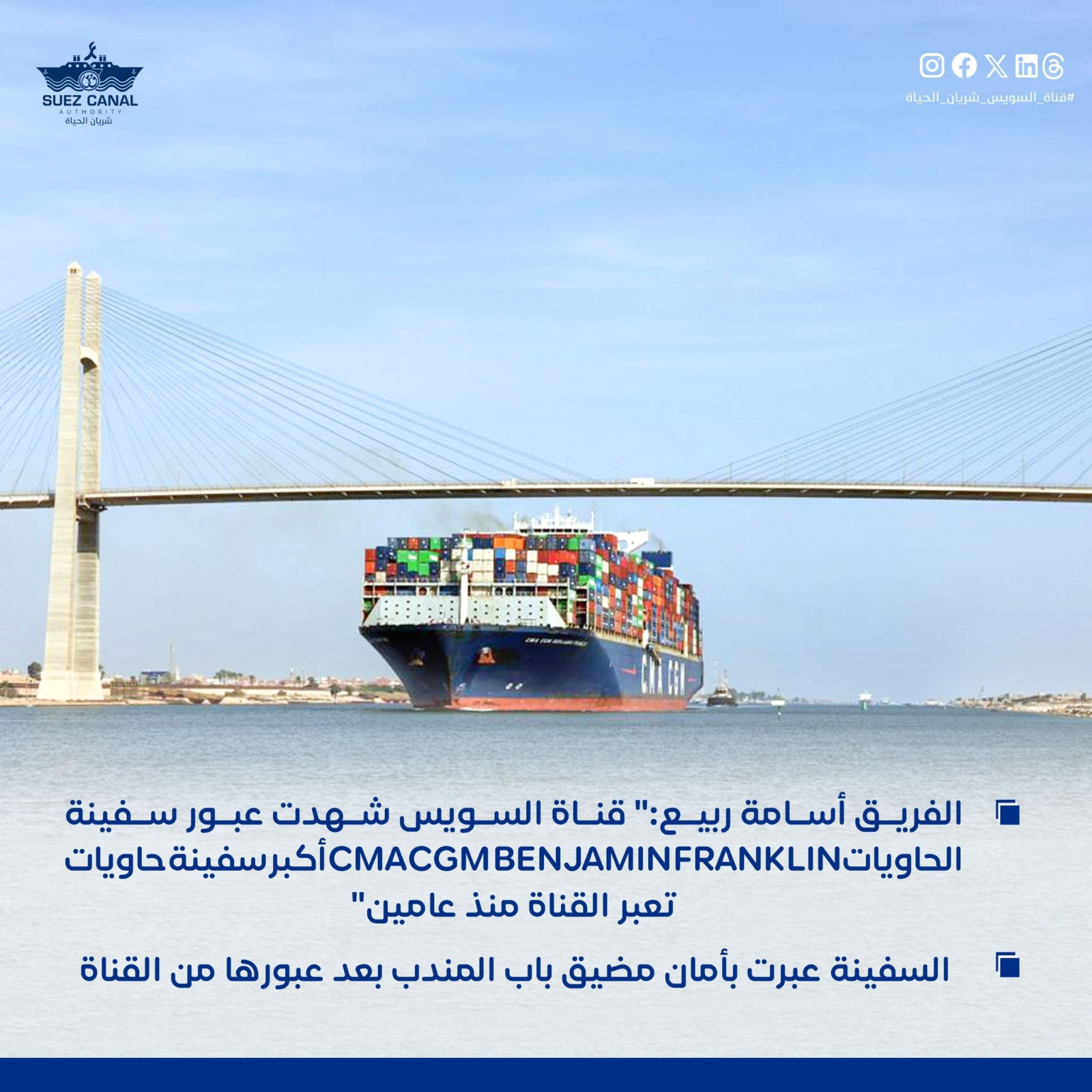 وتُعد تلك الرحلة هي الأولى لسفينة الحاويات العملاقة CMA CGM BENJAMIN FRANKLIN للعبور من قناة السويس وباب المندب منذ آخر عبور لها بتاريخ 22 أكتوبر 2023 بسبب توترات الأوضاع بالمنطقة.