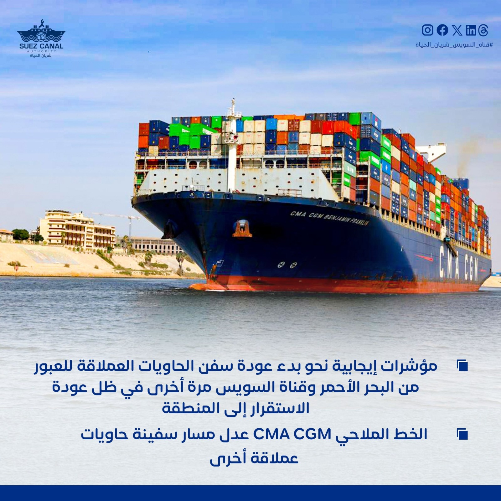 من جانبه، أكد الفريق أسامة ربيع رئيس هيئة قناة السويس أن عبور سفينة الحاويات CMA CGM BENJAMIN FRANKLIN للقناة ثم من مضيق باب المندب يعد مؤشرا إيجابيا نحو بدء عودة سفن الحاويات العملاقة للعبور من قناة السويس مرة أخرى في ظل عودة الاستقرار إلى منطقة البحر الأحمر.