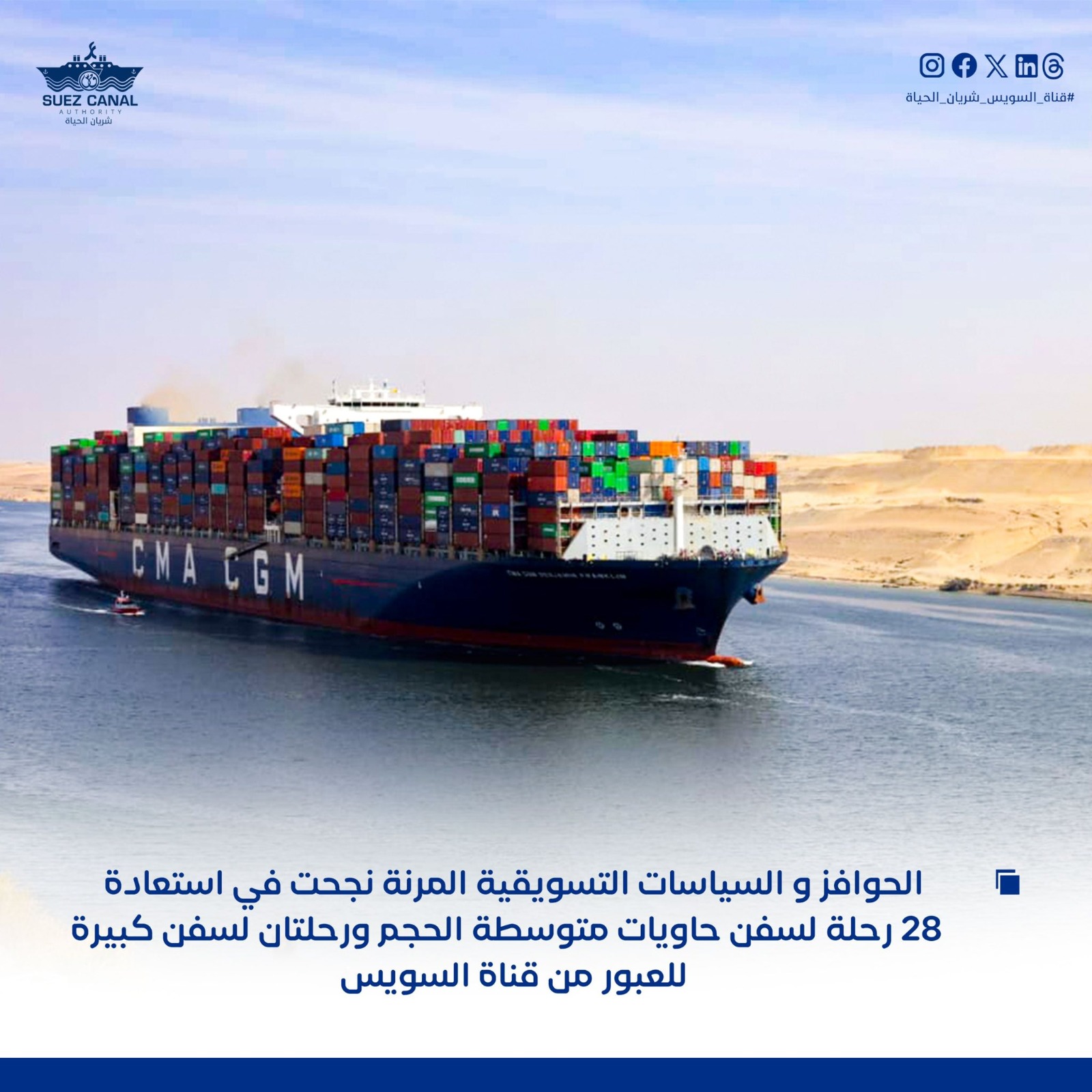 وأضاف رئيس الهيئة أن الحوافز و السياسات التسويقية المرنة التي انتهجتها الهيئة منذ مايو الماضي نجحت في استعادة 28 رحلة لسفن حاويات متوسطة الحجم بمتوسط حمولات من 130 إلى 160 ألف طن للعبور من قناة السويس مرة أخرى في رحلاتها من أوروبا إلى آسيا من بينها 19 رحلة تابعة للخط الملاحي "CMA CGM" و 9 رحلات تابعة للخط الملاحي "MSC" للعبور من القناة في خطوة تعكس تمسك الخطوط الملاحية الكبرى بالعبور من قناة السويس.