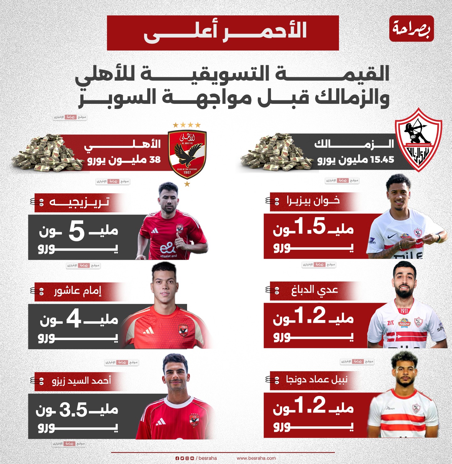 يرصد موقع “بصراحة” القيمة التسويقية لفريقي الأهلي والزمالك، قبل اللقاء المرتقب بين الناديين، مساء اليوم، ضمن منافسات بطولة السوبر المصري الجديد 2025/2026.