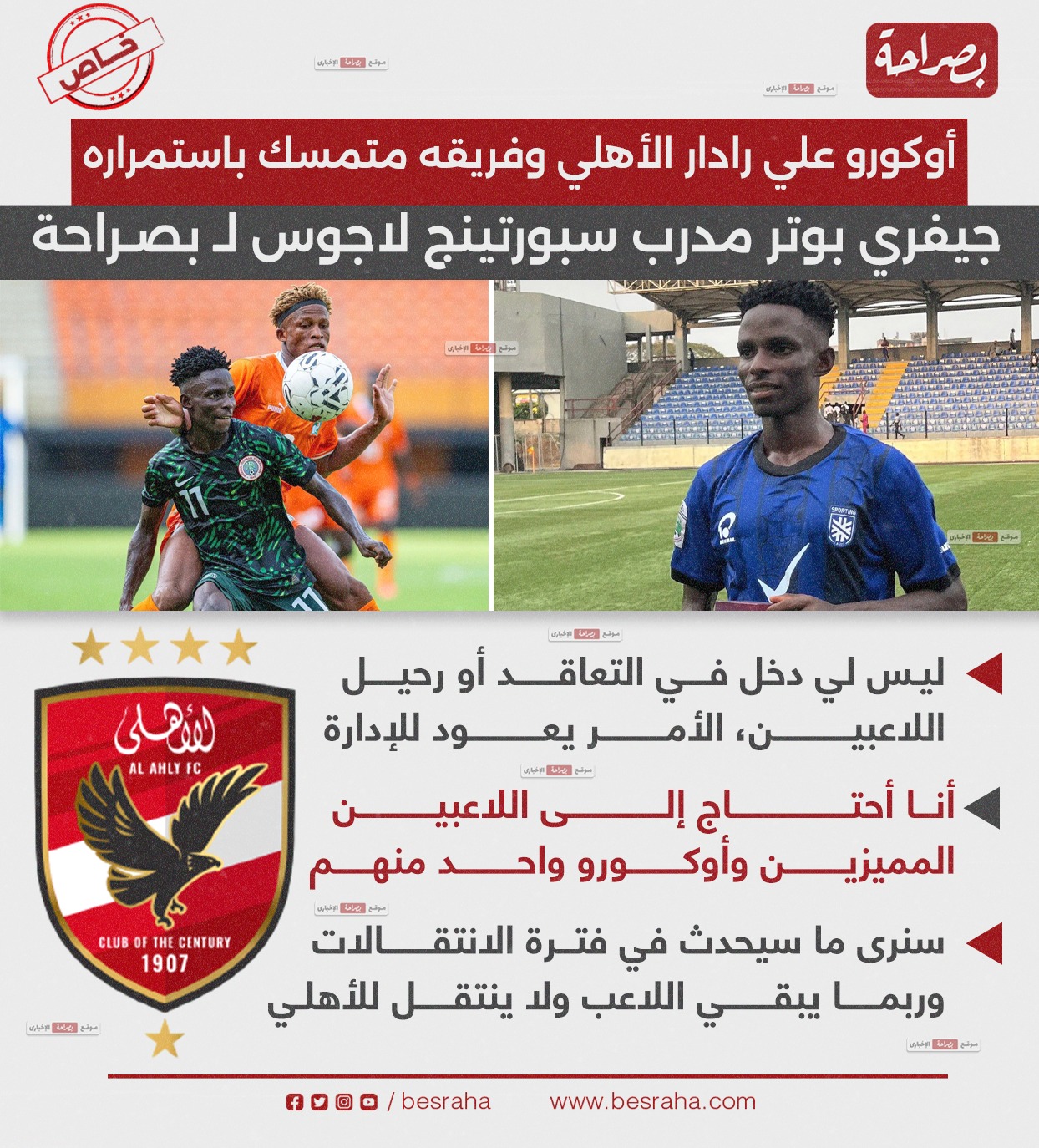كشف المدرب جيفري بوتر، المدير الفني لفريق سبورتينج لاجوس، عن موقفه من رحيل الظهير الأيسر النيجيري، أوديناكا أوكورو إلى النادي الأهلي.