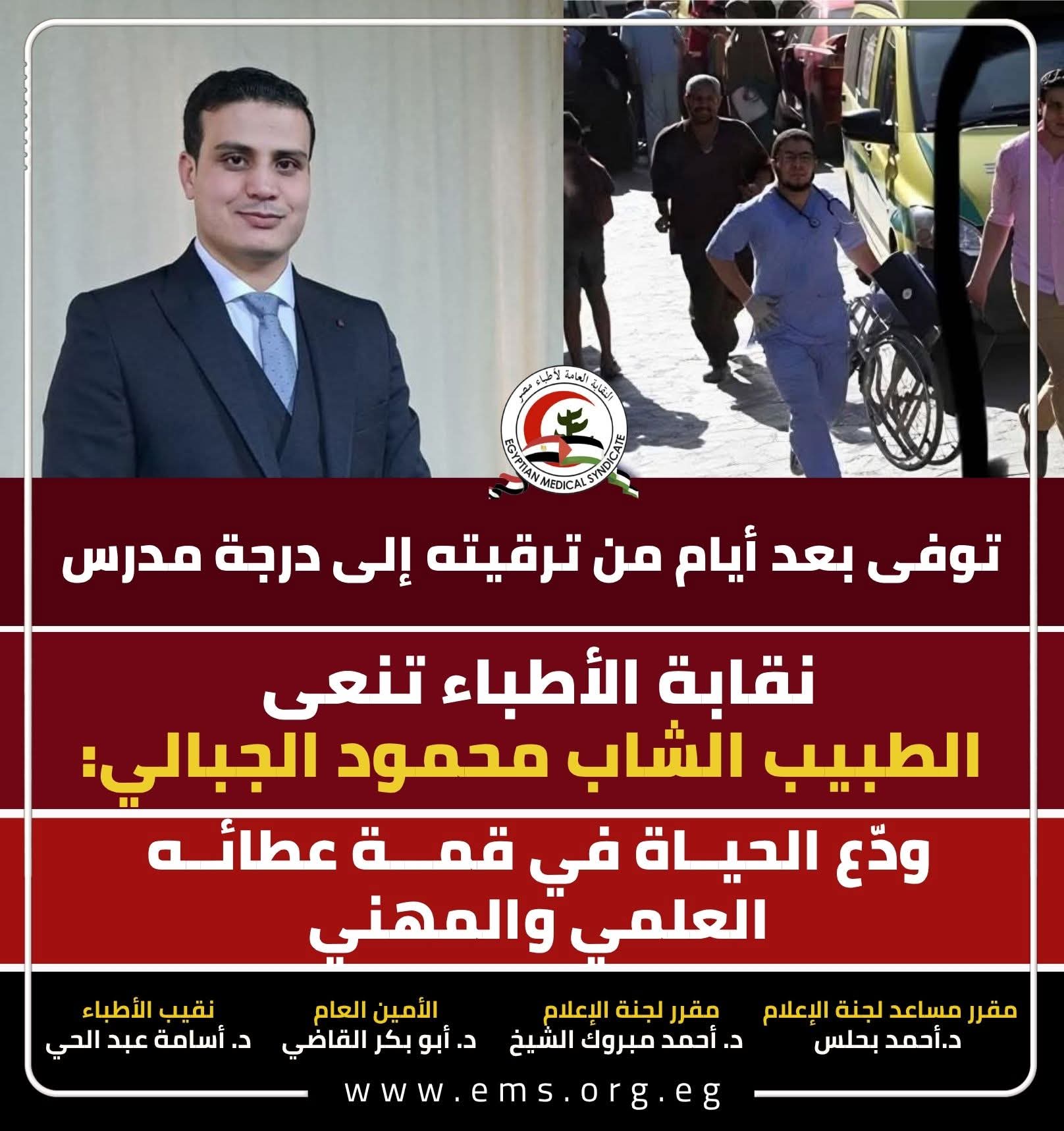 توفى بعد أيام من ترقيته.. نقابة الأطباء تنعى الطبيب الشاب محمود الجبالي