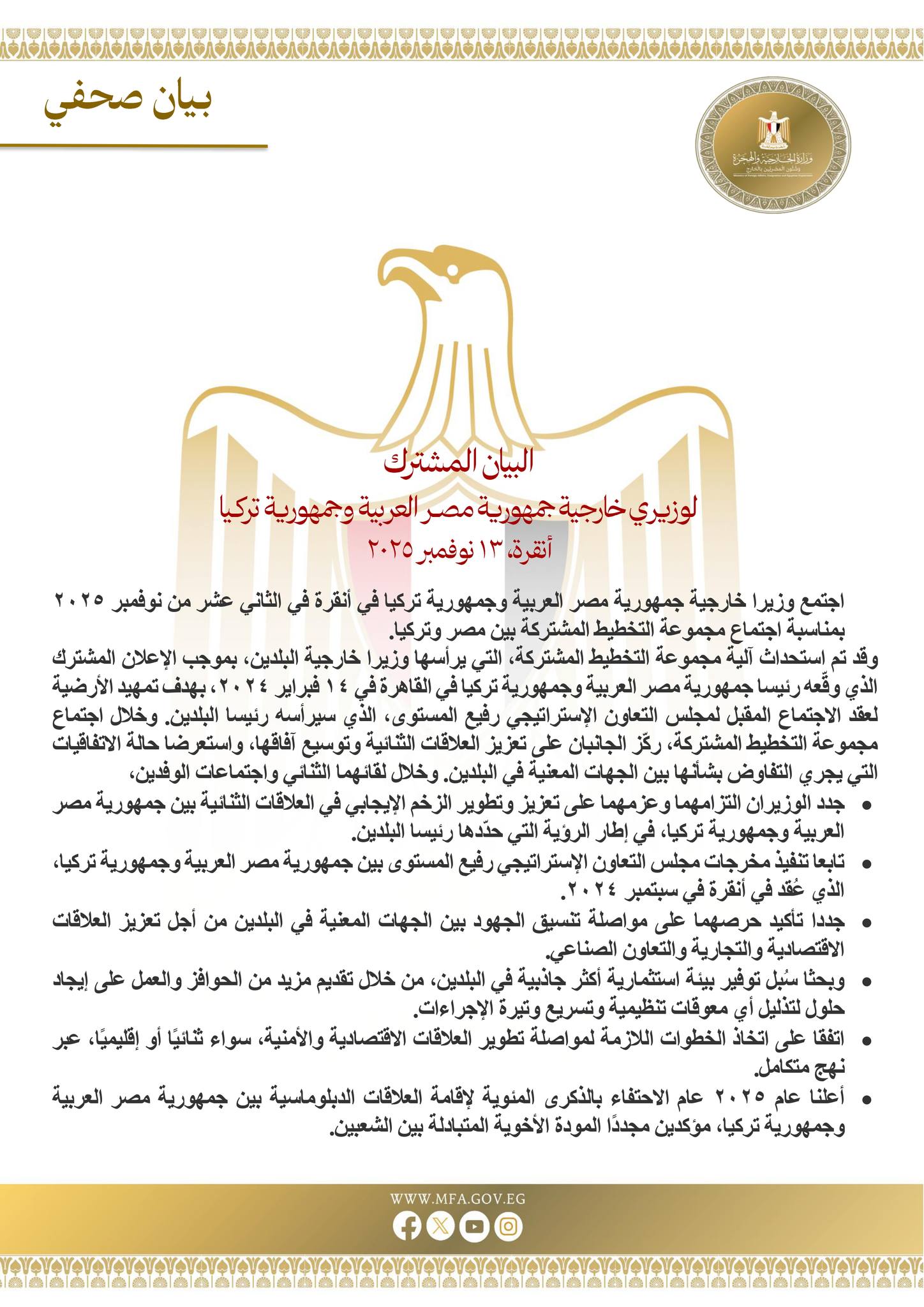 اجتمع وزيرا خارجية جمهورية مصر العربية وجمهورية تركيا في أنقرة في الثاني عشر من نوفمبر ۲۰۲٥ بمناسبة اجتماع مجموعة التخطيط المشتركة بين مصر وتركيا.
