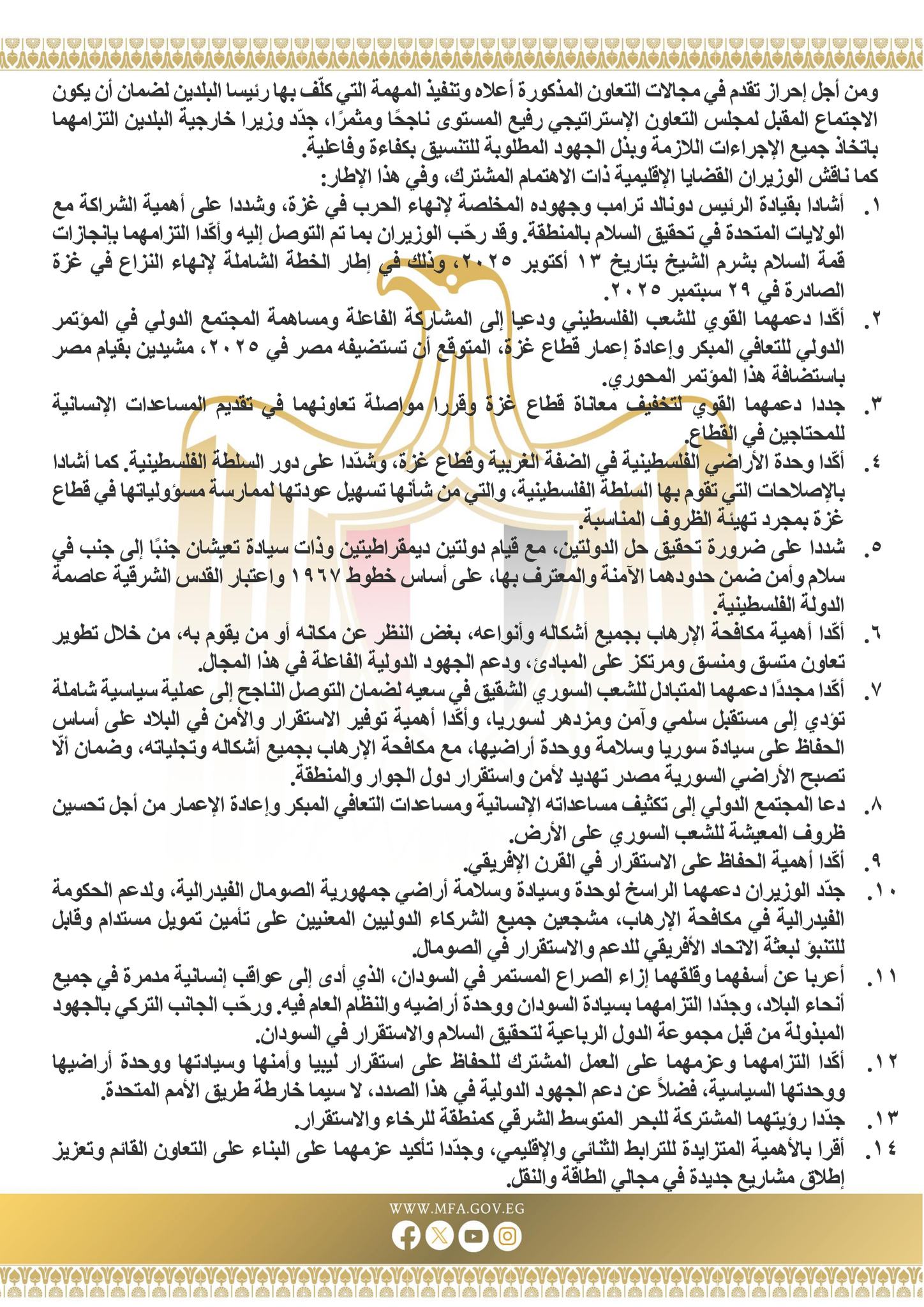 - تابعا تنفيذ مخرجات مجلس التعاون الإستراتيجي رفيع المستوى بين جمهورية مصر العربية وجمهورية تركيا الذي عقد في أنقرة في سبتمبر ٢٠٢٤.