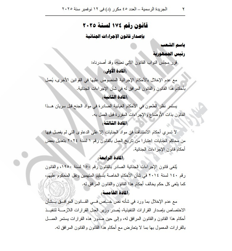 نشرت الجريدة الرسمية تصديق السيد الرئيس عبد الفتاح السيسي على القانون رقم 174 لسنة 2025، الصادر بشأن إصدار قانون الإجراءات الجنائية.
