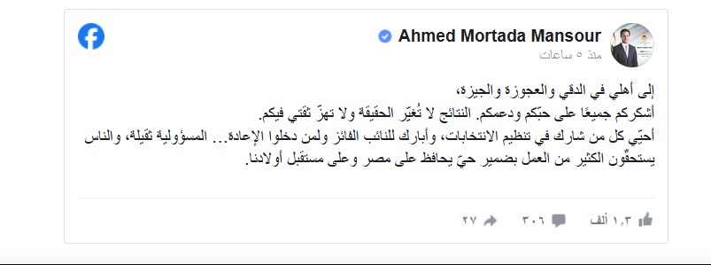 وقال “منصور” في منشور عبر صفحته على موقع التواصل الإجتماعي “فيسبوك”:“إلى أهلي في الدقي والعجوزة والجيزة، أشكركم جميعًا على حبّكم ودعمكم، كما ان النتائج لا تُغيِّر الحقيقة ولا تهزّ ثقتي فيكم، وأحيّي كل من شارك في تنظيم الانتخابات، وأبارك للنائب الفائز ولمن دخلوا الإعادة.