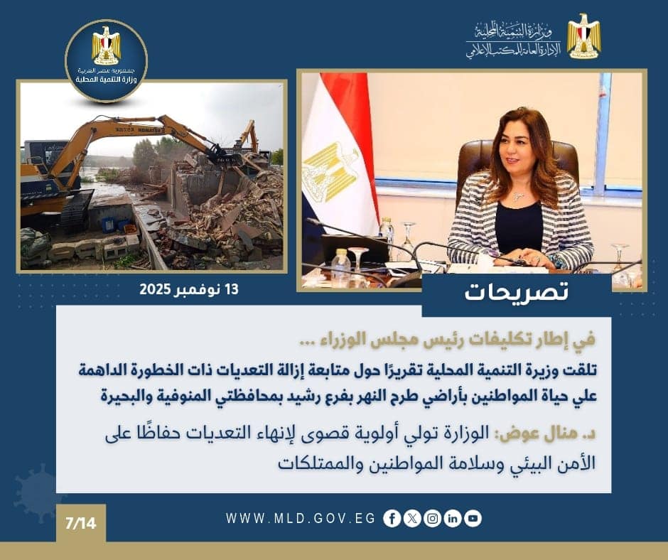 وتلقت الدكتورة منال عوض وزيرة التنمية المحلية والقائم بأعمال وزيرة البيئة، تقريرًا مفصلًا من رئيس قطاع الإدارة الاستراتيجية والتنمية المحلية بالوزارة، حول الموقف التنفيذي لأعمال إزالة التعديات على أراضي طرح النهر داخل القطاع المائي لمجرى نهر النيل وفرعيه، وخاصة فرع رشيد بمحافظتي المنوفية والبحيرة، وذلك تنفيذًا لتكليف رئيس مجلس الوزراء خلال اجتماع مجلس المحافظين رقم (60) لإزالة التعديات علي طرح النهر.