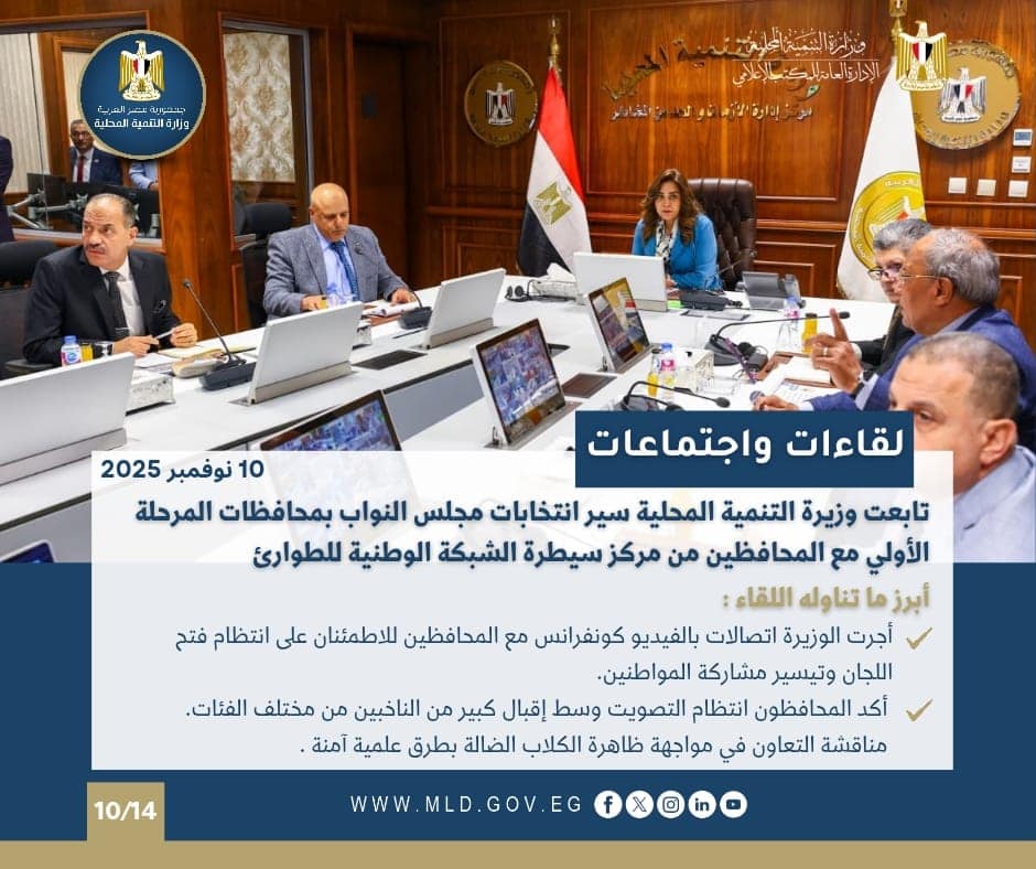 تلقت الدكتورة منال عوض وزيرة التنمية المحلية والقائم بأعمال وزير البيئة، تقريرًا من غرفة العمليات المركزية بالوزارة حول سير فعاليات اليوم الثاني لانتخابات مجلس النواب 2025 بمحافظات المرحلة الأولى، والتي تتابع الوزارة تنفيذها بالتنسيق مع غرف العمليات في جميع المحافظات، ومركز السيطرة الرئيسي للشبكة الوطنية للطوارئ والسلامة العامة.